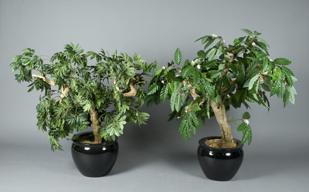 Includes a pot 11" H, containing a tree with blossoms and berries. Together with a 12" H pot with leafy tree.