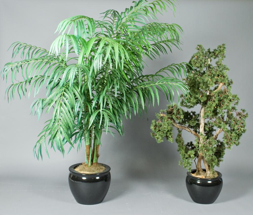 Includes a pot 13.25" H, with faux Areca tree. Together with a pot 11" H, with faux tree with pinecones.