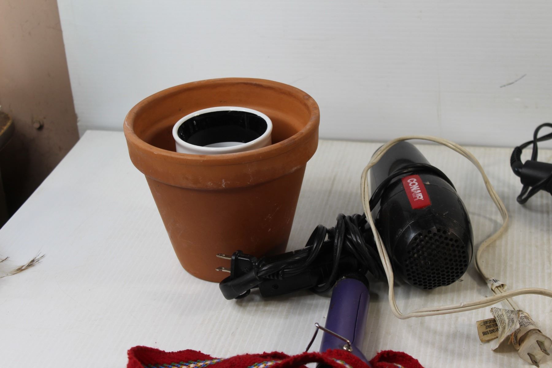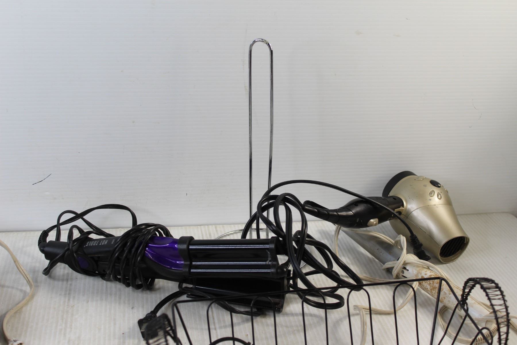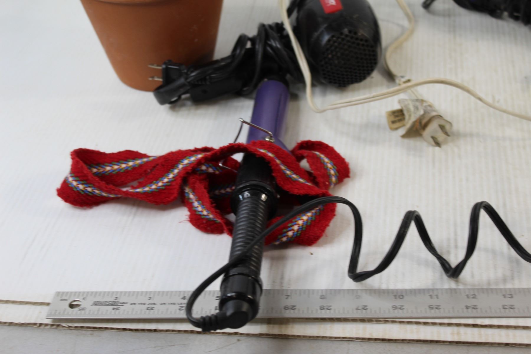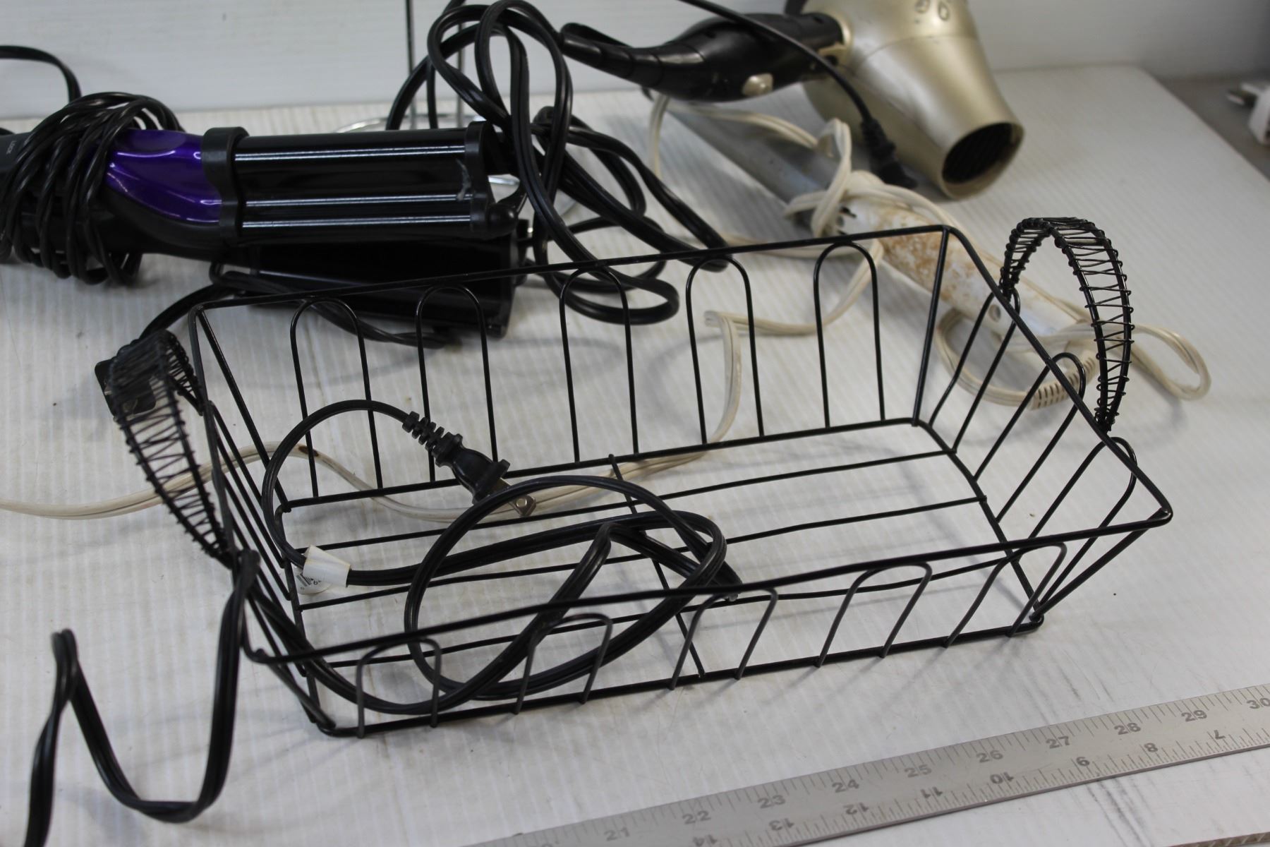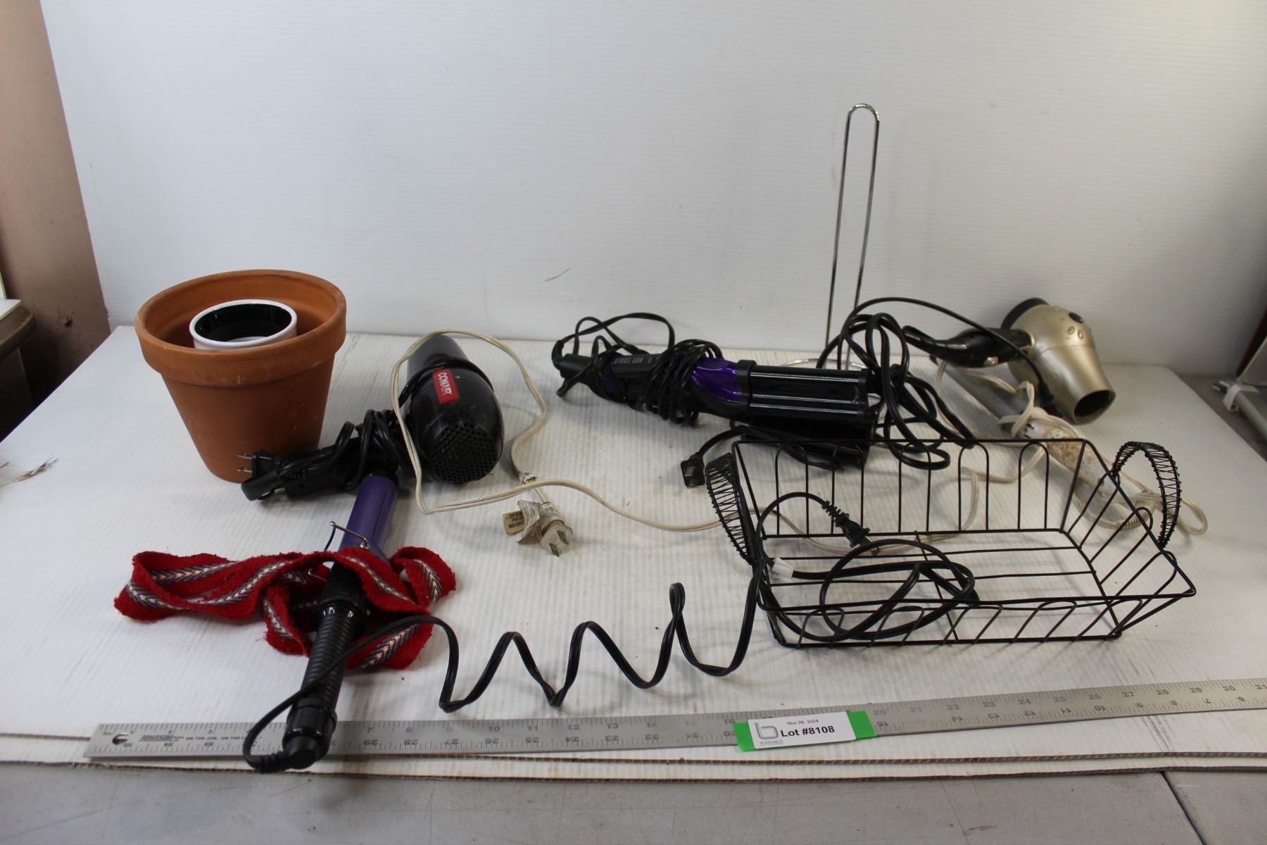 (2) Blow-dryers - Tested Powers On, (2) Curling Irons - As is, (2) Planters, Wire Rack