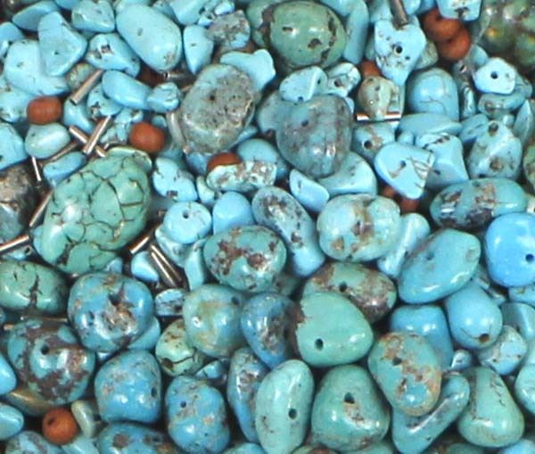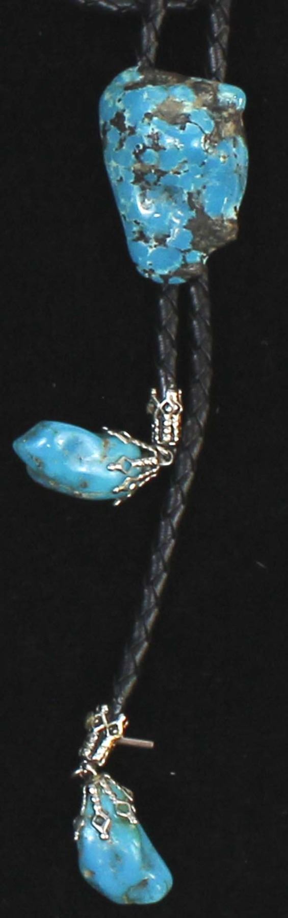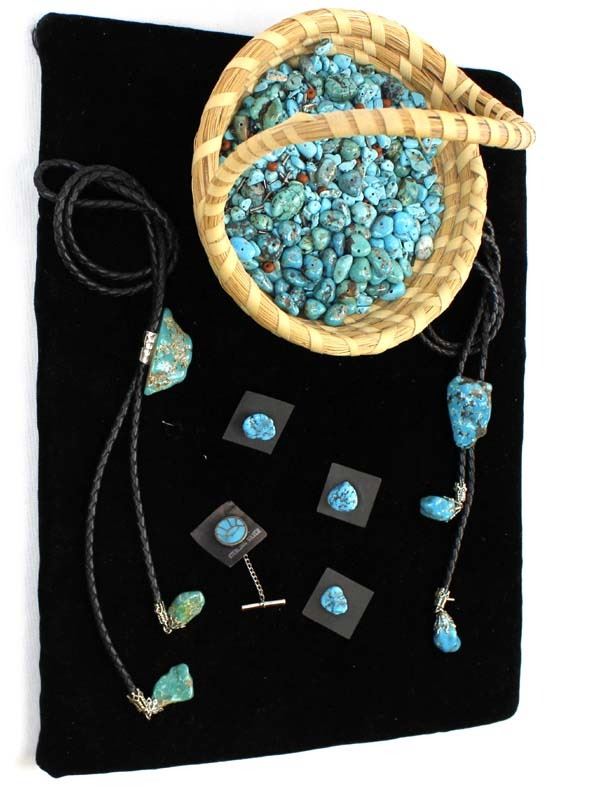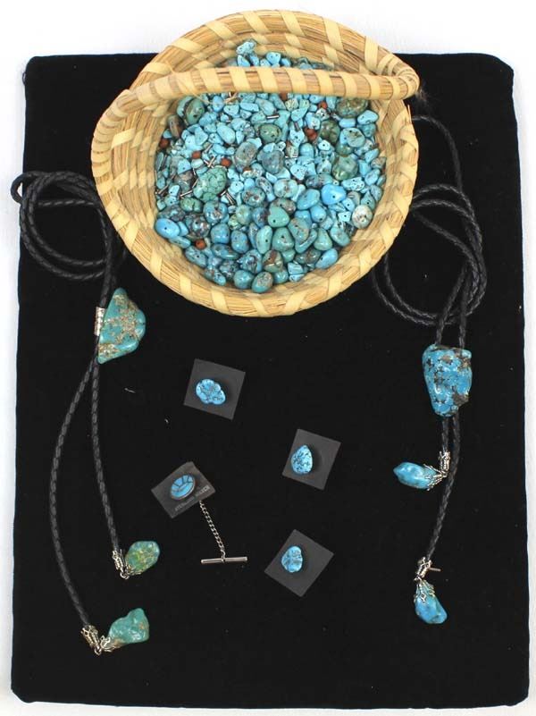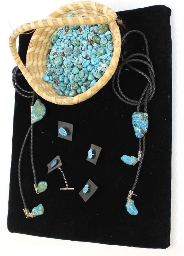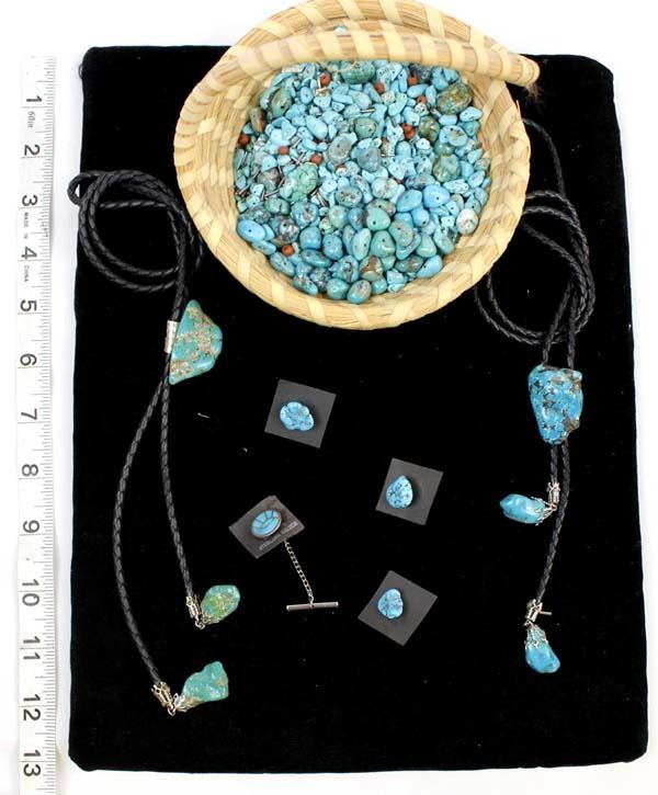 2 Turquoise Nugget Bolo Ties, 2 Native American Turquoise Tie Tacks, & Basketful of Turquoise Nugget Beads, largest turquoise nugget measures 1.5''L, both bolos are on braided leather ties with turquoise nugget aglets, lots of beautiful turquoise