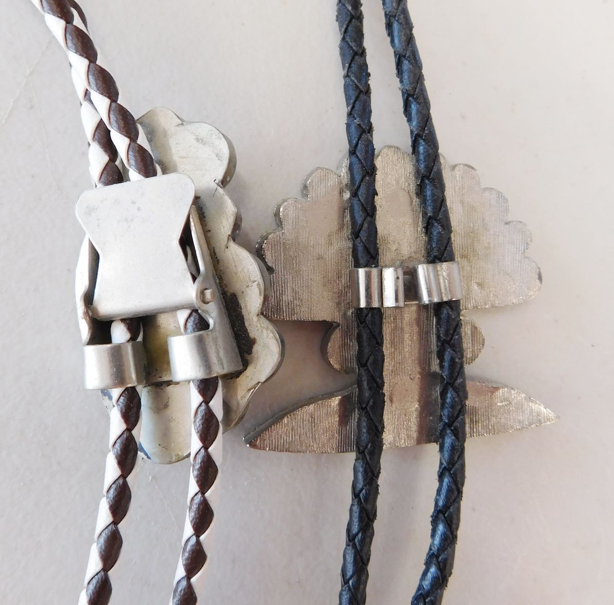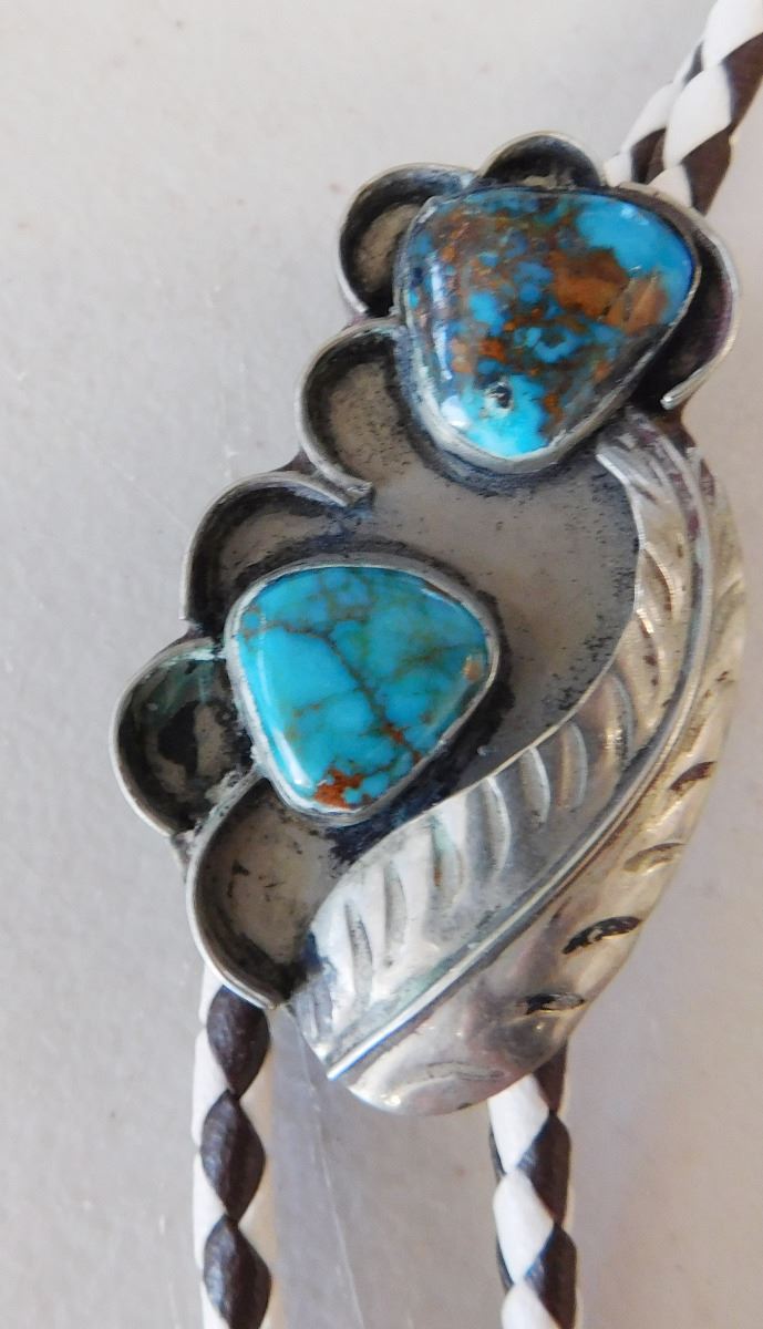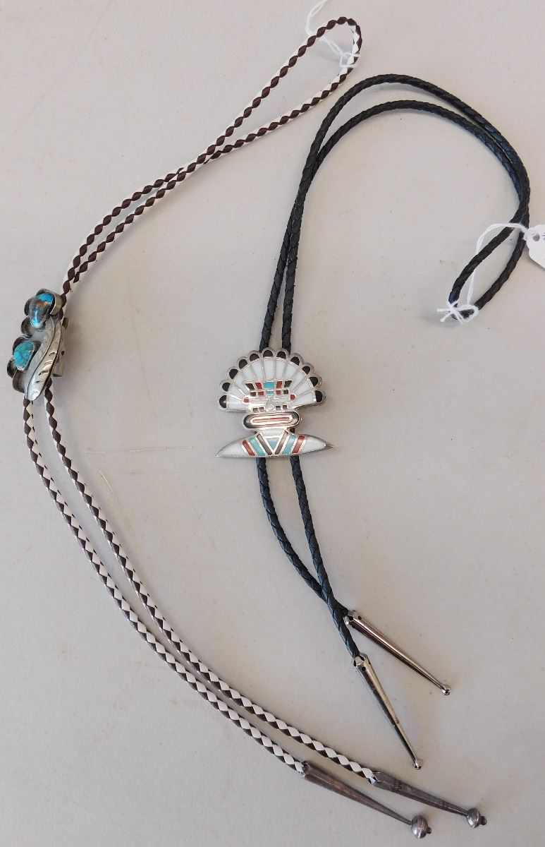 2 Bolo Ties, circa 1960s. Made of nickel silver, turquoise and sterling silver, these items measure 36" long each. Navajo. The brown/white cord drops tested postitive as sterling. No other sterling in lot. Condition: Good, see images. Shipping: $15.50.