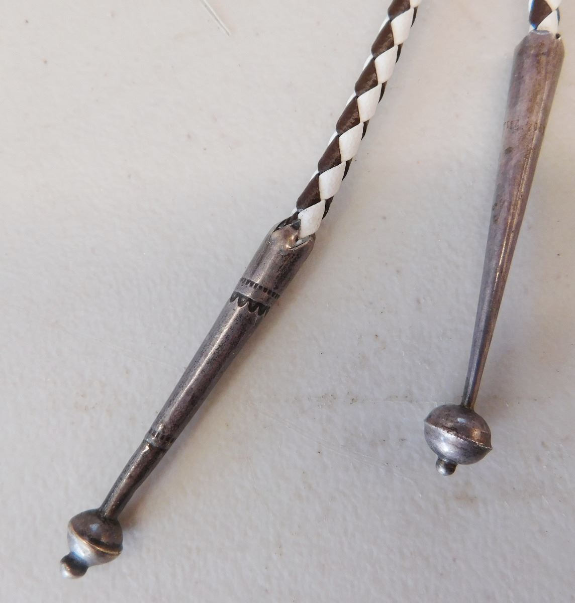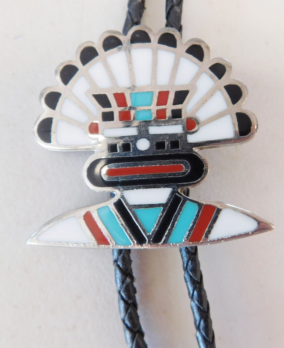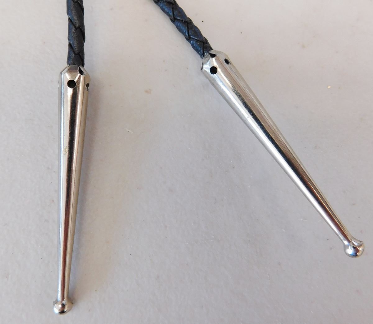 2 Bolo Ties, circa 1960s. Made of nickel silver, turquoise and sterling silver, these items measure 36" long each. Navajo. The brown/white cord drops tested postitive as sterling. No other sterling in lot. Condition: Good, see images. Shipping: $15.50.