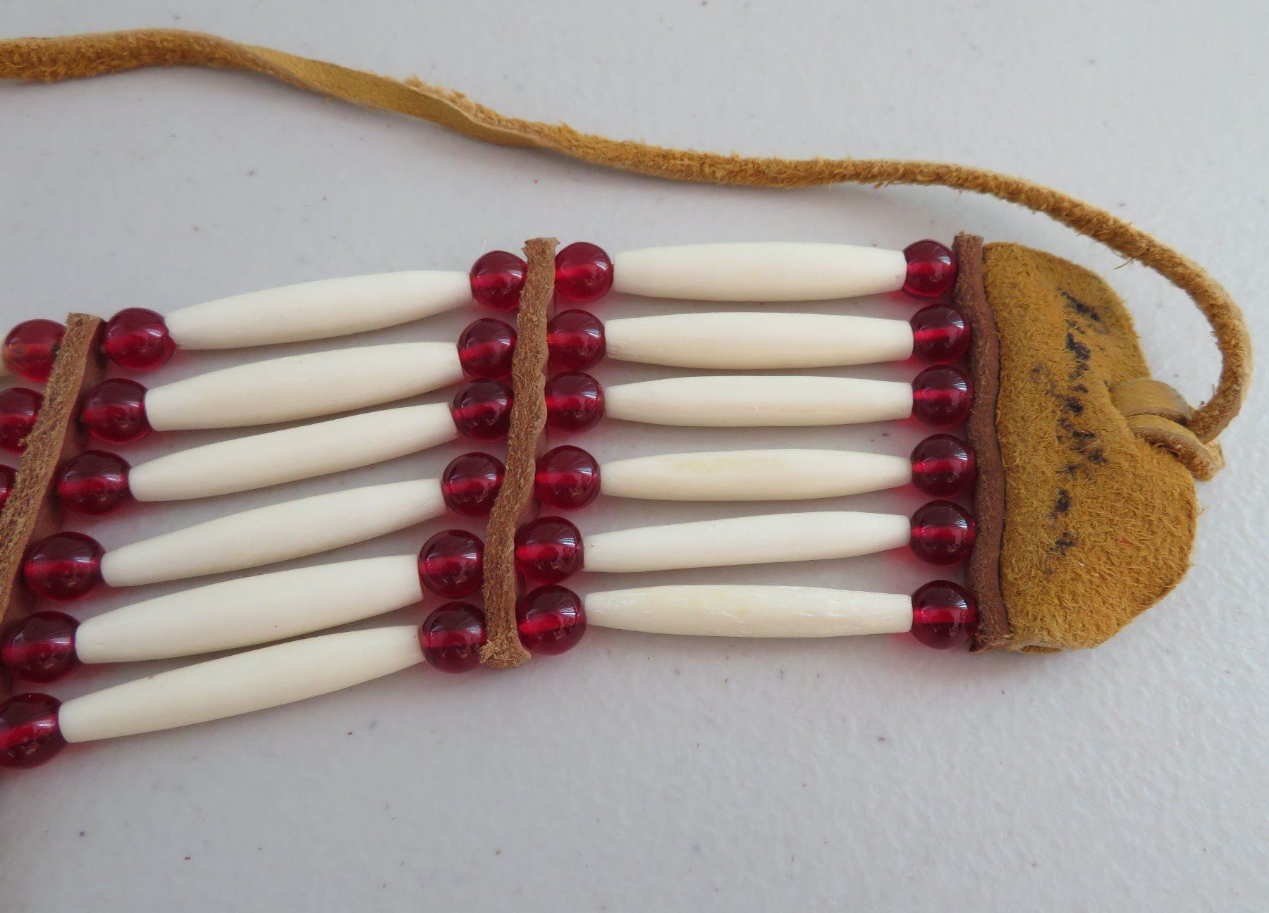 2 Bone & Beaded Necklaces, modern items. Made of bone, leather, beads, shell and tin cones, the items measure 15" x 4 1/2" and 16" x 3 1/2". Plains Indian, one signed Rising Bear. Nice choker-type necklaces stylized in breast-plate fashion. Condition: Good, see images. Shipping: $15.50 w/insurance and signature.