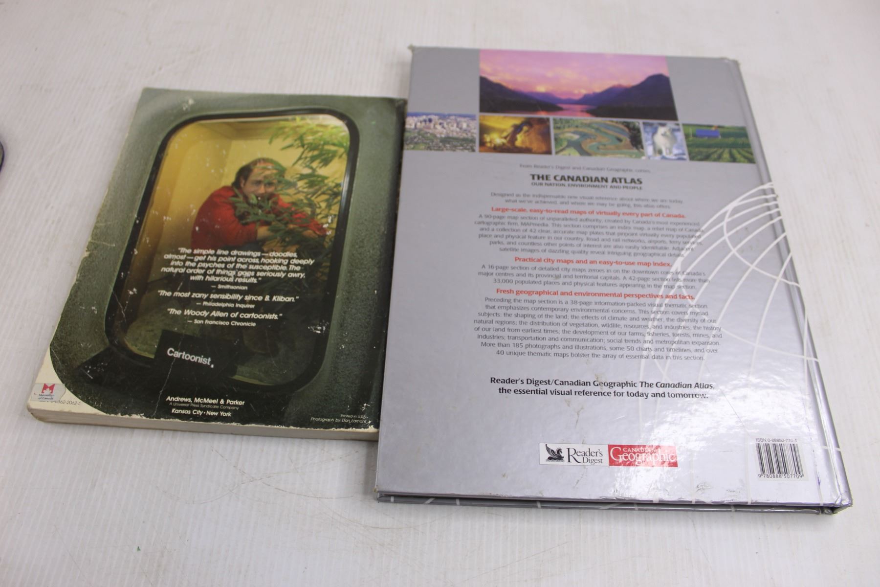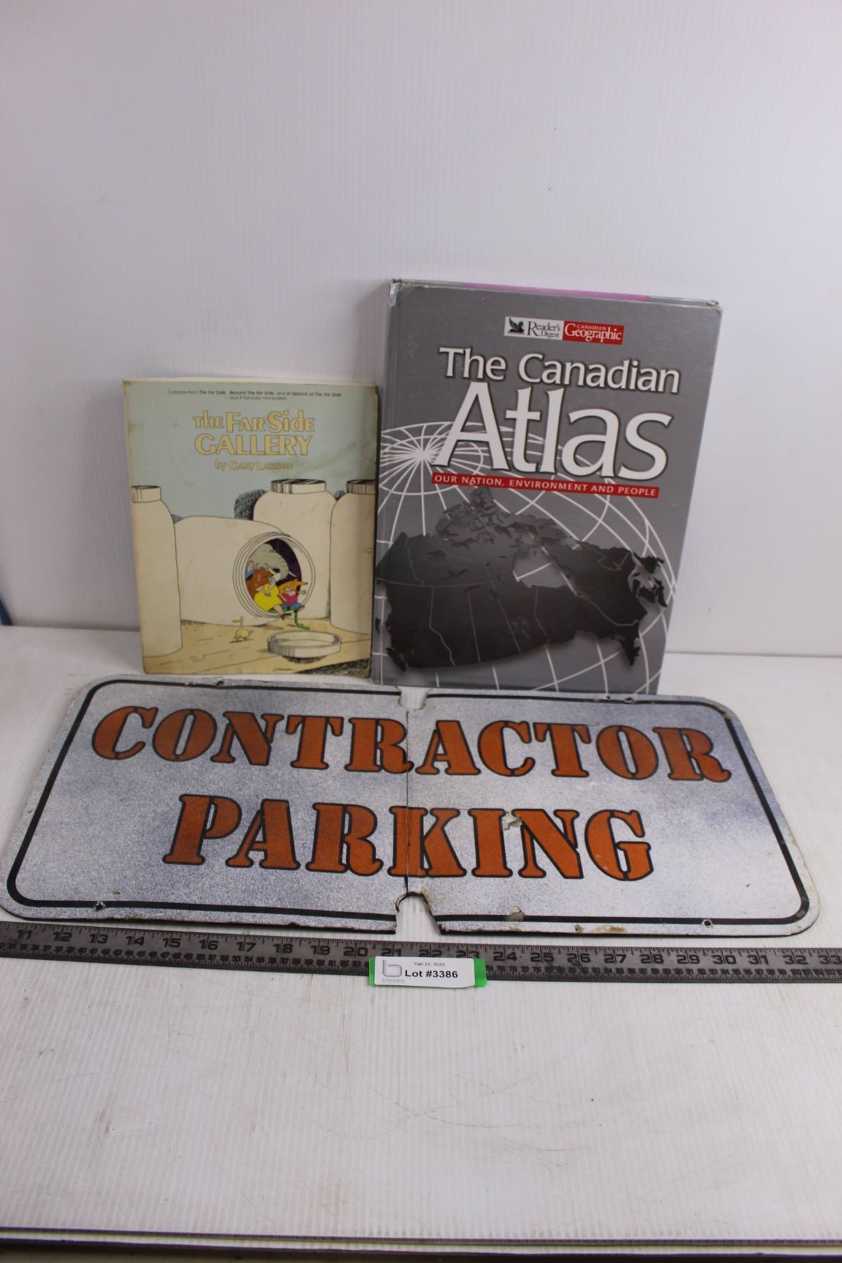 (2) Books (Canadian Atlas, Far Side Cartoon Book), Metal Sign "Contractor Parking" 24" x 12"