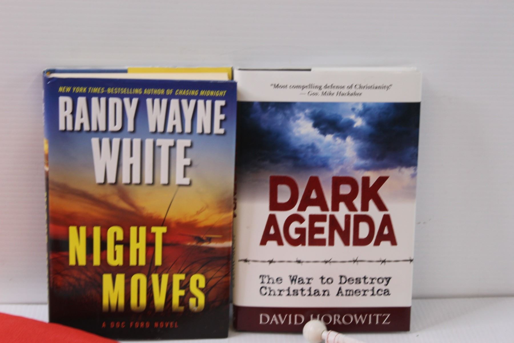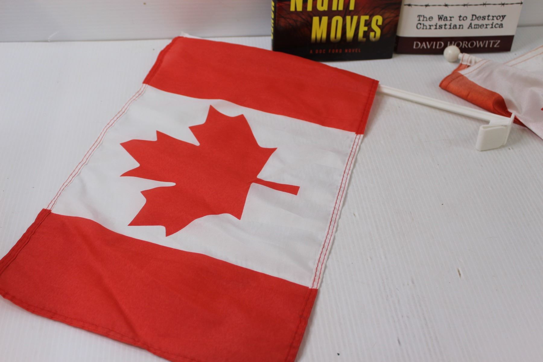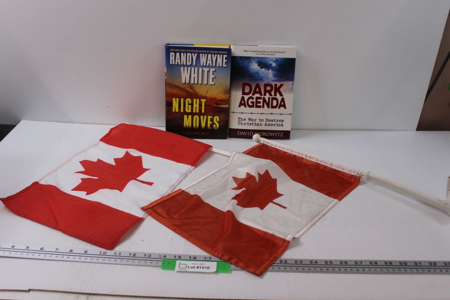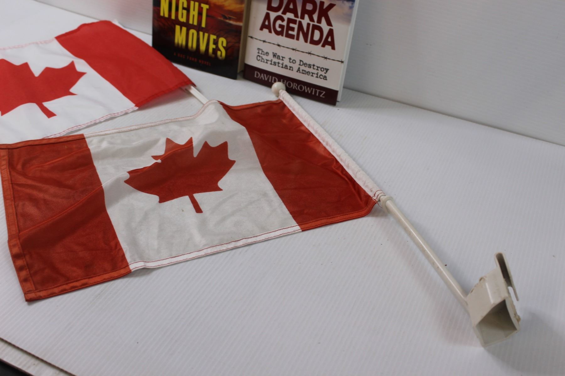 (2) Books: Night Moves & Dark Agenda, (2) Canadian Vehicle Flags