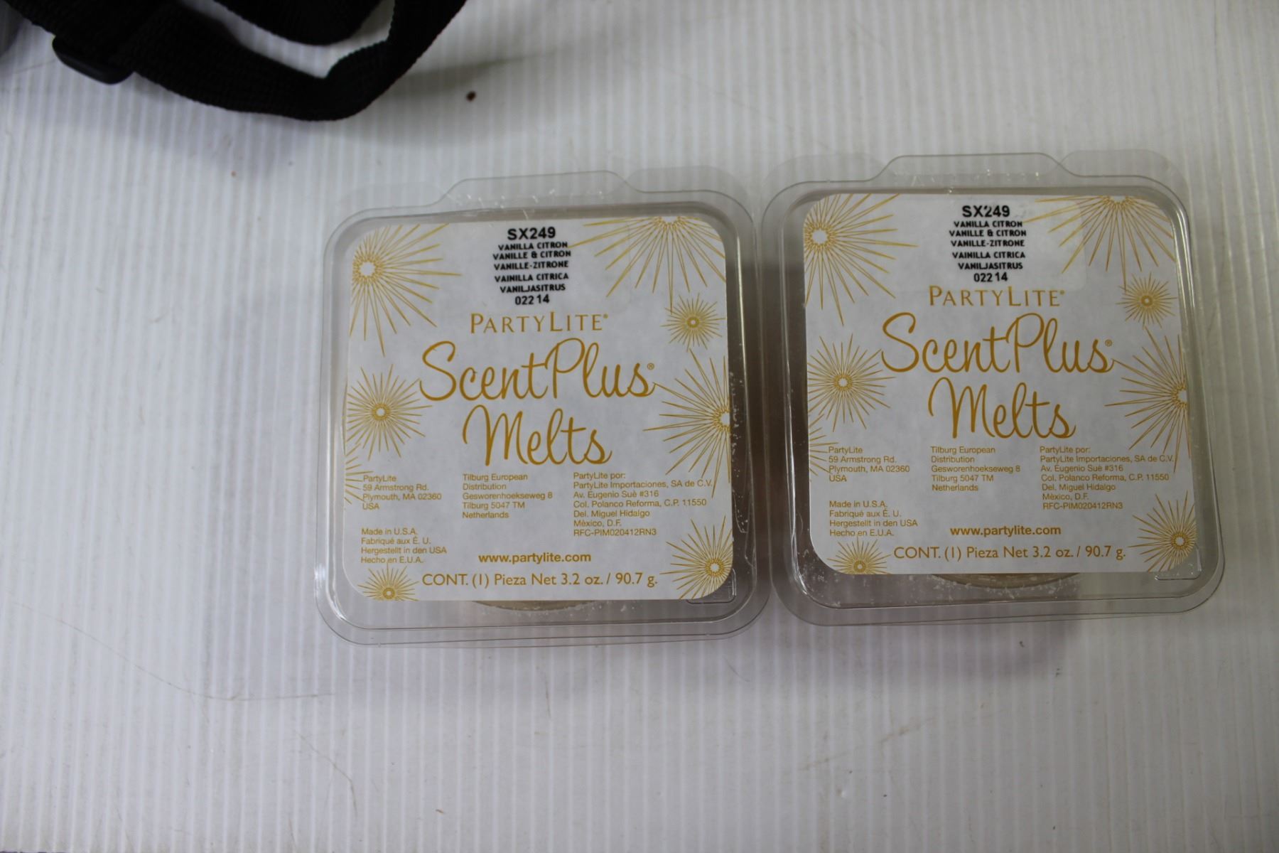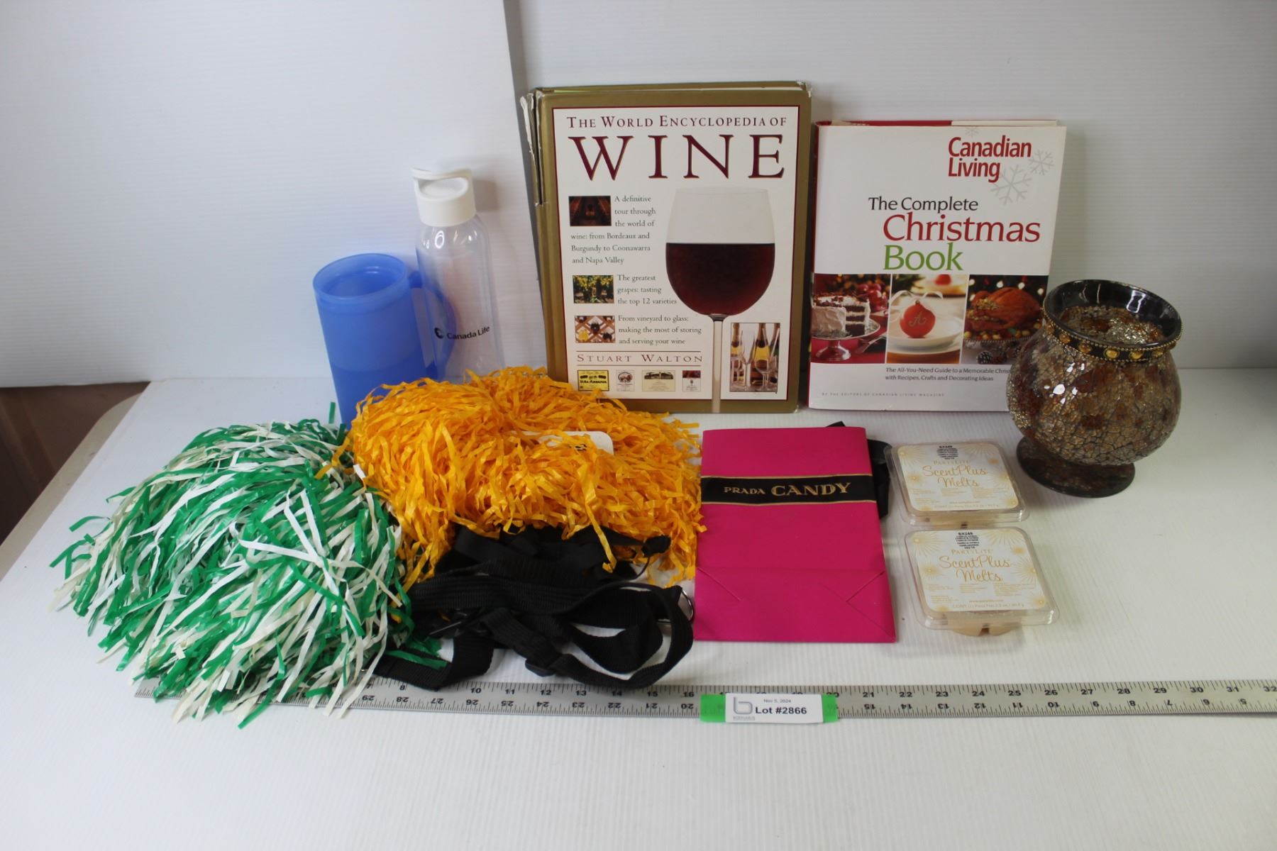 (2) Books (World Encyclopedia of Wine, Canadian Living Complete Christmas Book), (2) Partylite Scent Plus Melts (Unused), Decorative Vase 6" Tall x 5.5", Freezer Mug, CFL Themed Pompoms, misc.
