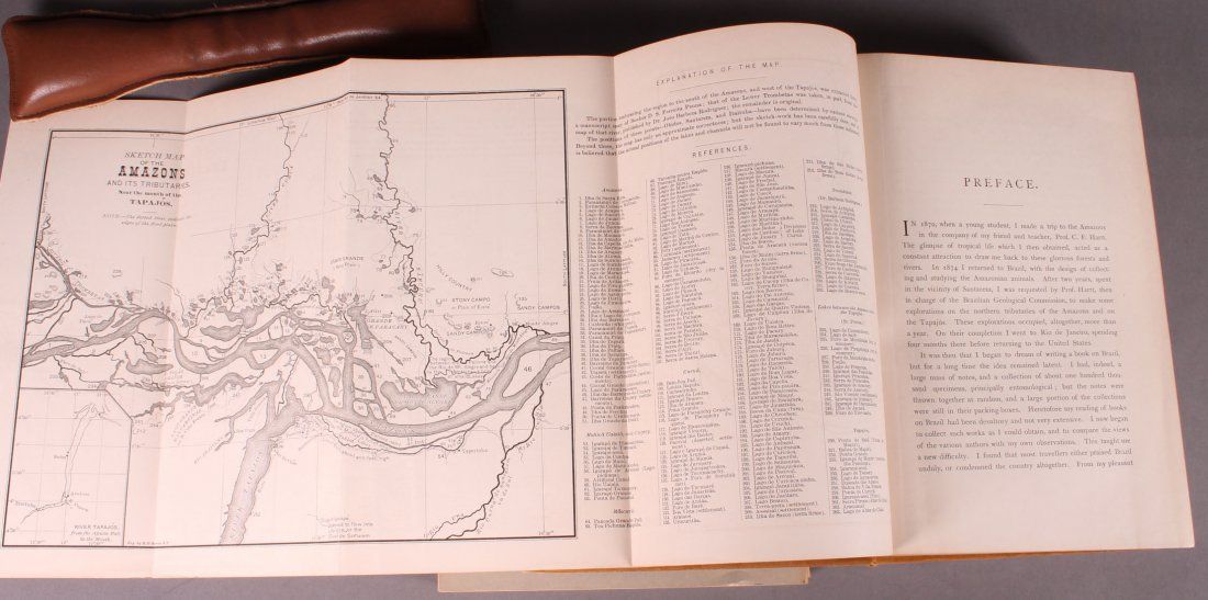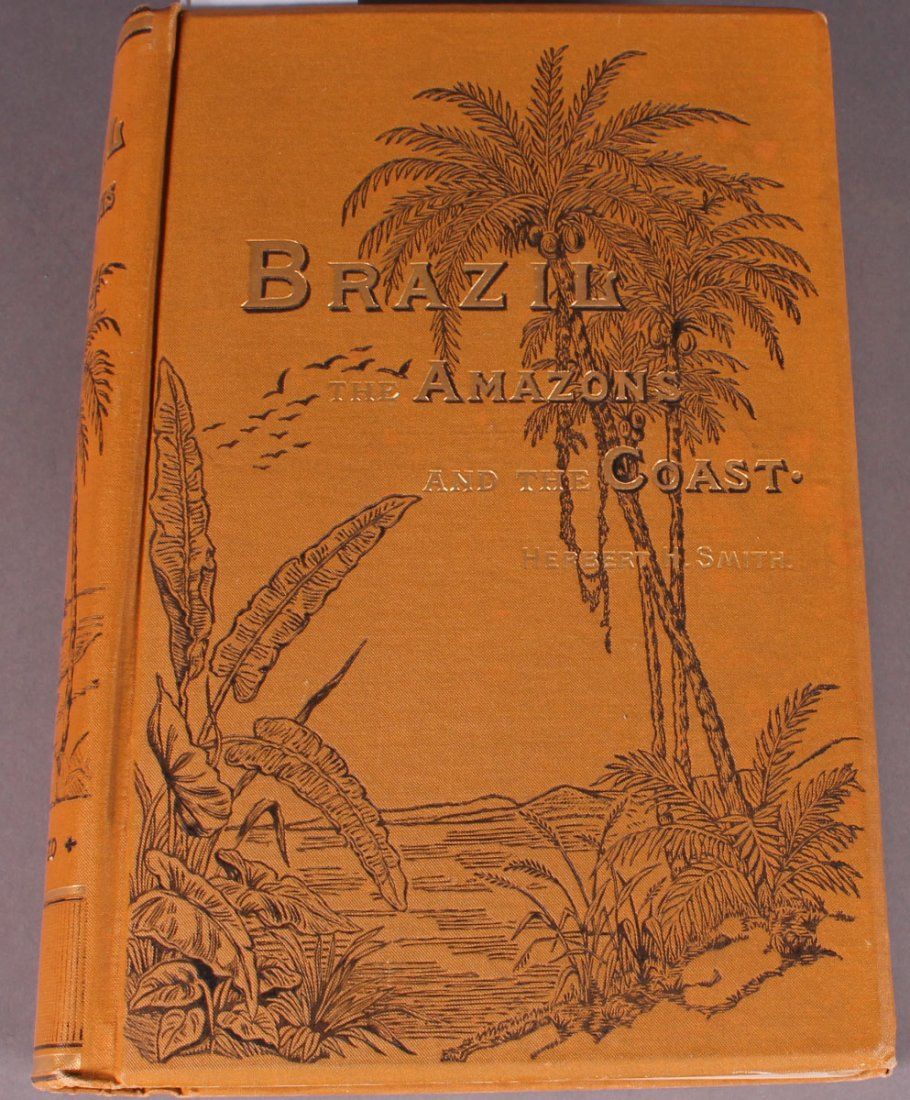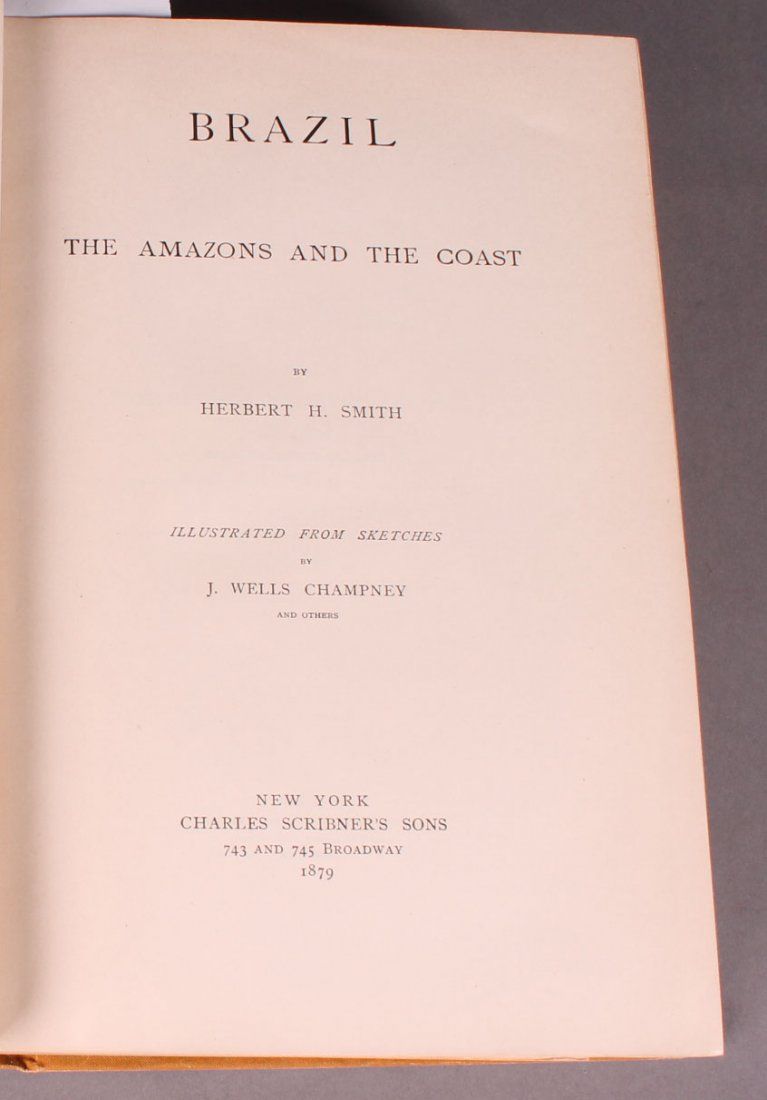 [Latin America/Brazil]. 2 Titles (3 Vols). ++ Herbert H. Smith. BRAZIL: The Amazons and the Coast. Illustrated by J. Wells Champney, et. al. NY: Charles Scribner?s Sons, 1879. Thick 8vo. Orig mustard cloth stamped in black, gilt lettering. Very good plus. Folding map. The author went to Brazil with C. F. Hartt on the 1870 Morgan Expedition, and again in 1874. 1st edition. ++ A. Henry Savage Landor. ACROSS UNKNOWN SOUTH AMERICA. 2 Vols. Lon/NY/Toronto: Hodder & Stoughton, (1913). Thick 4to. Navy blue cloth. Some soiling to covers, wear at corners, rear hinges cracked, foxing. Photo-illustrated, folding map.