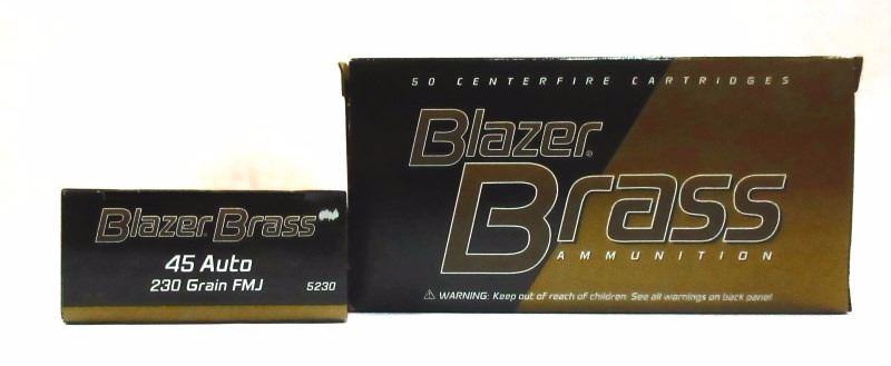 2 Boxes of Blazer Brass 45 Auto. 230 Grain. Full Metal Jacket. 50 Cartridges per box. ESTIMATE:$35-$45
