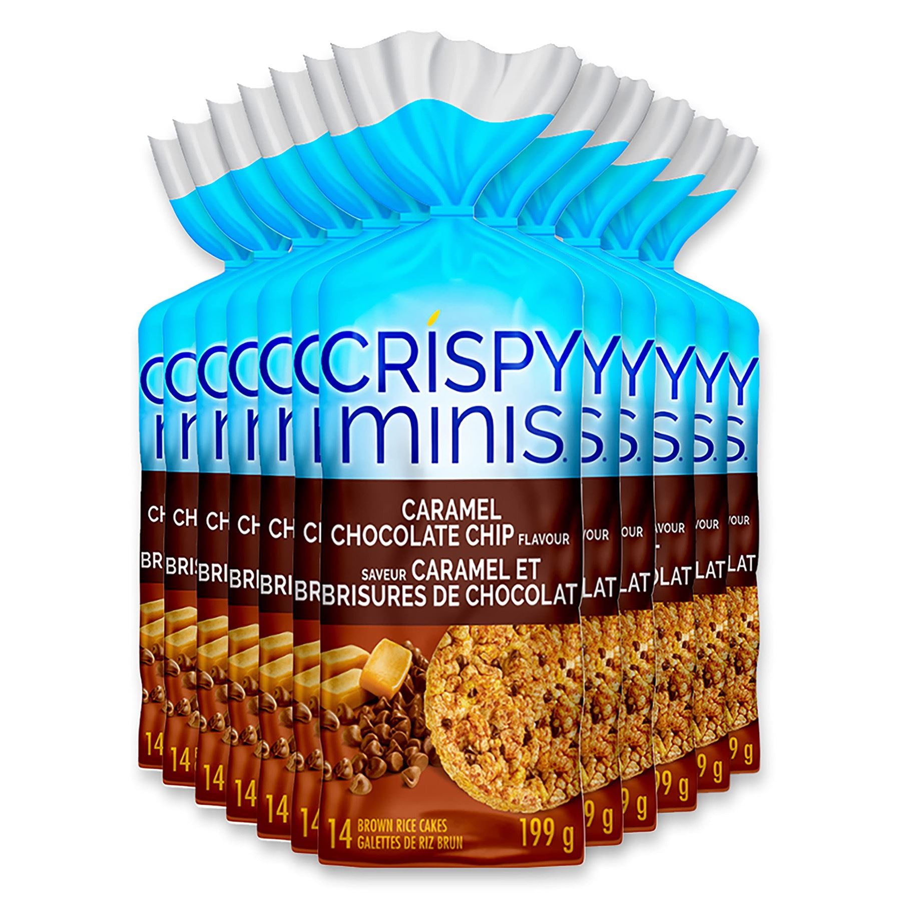 2 Boxes of Caramel Chocolate Chip Crispy Minis Rice Cakes - each box includes 12 bags of 199g each.
