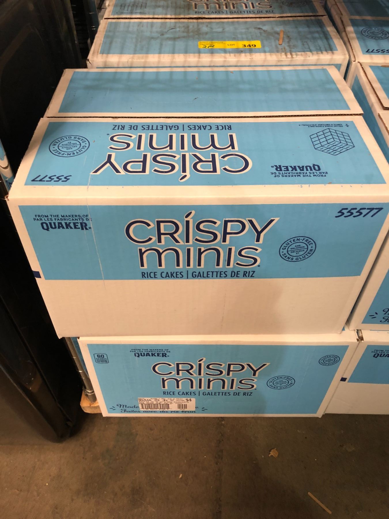 2 Boxes of Caramel Chocolate Chip Crispy Minis Rice Cakes - each box includes 12 bags of 199g each. BB 2023, June, 17th