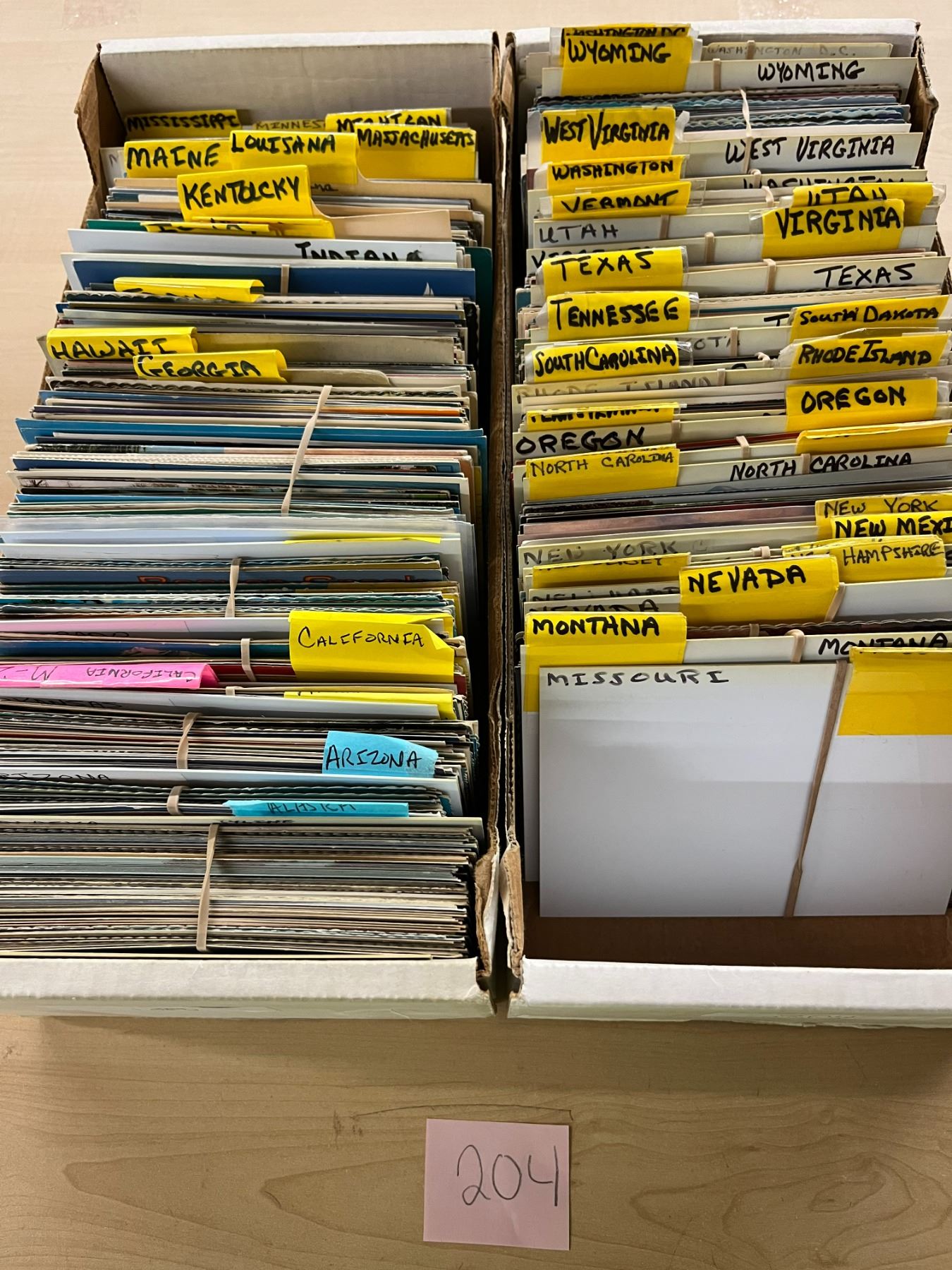2 boxes of over 1000 continental size postcards. Sorted by states.