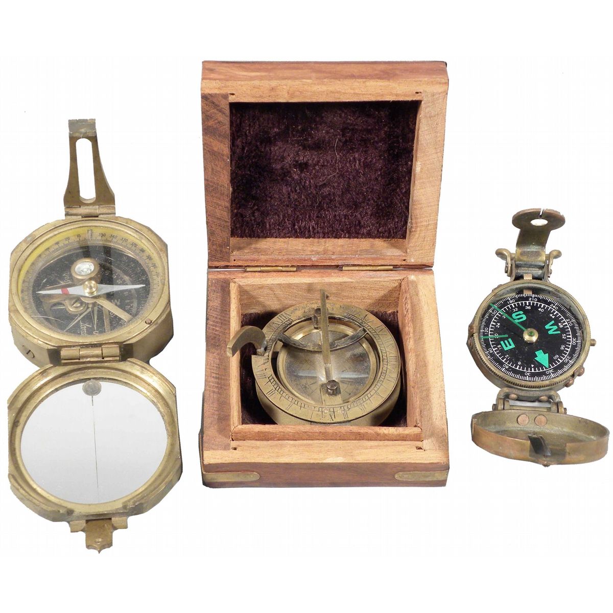 2 Brass Compass' and Brass Sextant in Wood Box. Small compass dated 1914 W.E. Harris-London and Brinton Compass Ross Evans-London. Sextant F.L. West-London. All in good original condition.