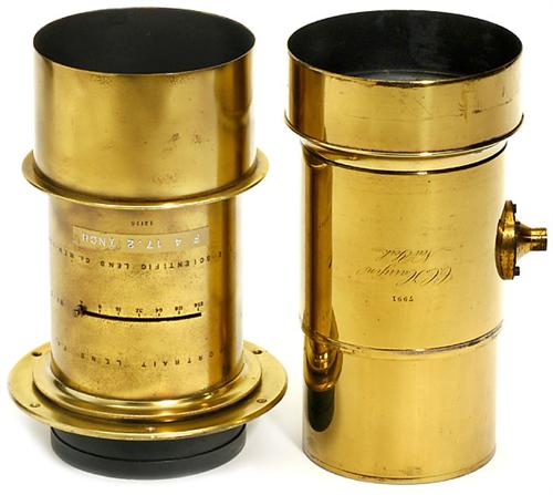 2 Messingobjektive 1) The Scientific Lens Co., New York. "Portrait Lens F4", um 1900, 8 x 10, Nr. 12135, mit Irisblende, Glas trübe, Höhe: 22 cm, Ø 13 cm, mit Anschraubring. - Und: 2) Projektionsobjektiv, um 1890, Gravur: C. C. Harrison, New York, Nr. 7991, Höhe: 21 cm, Ø 12 cm, zaponiert, mit schönem Messingfrontdeckel.