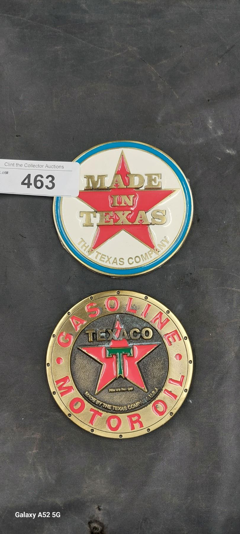 2 Brass Texaco and made in Texas desk top paper weights, 4" di