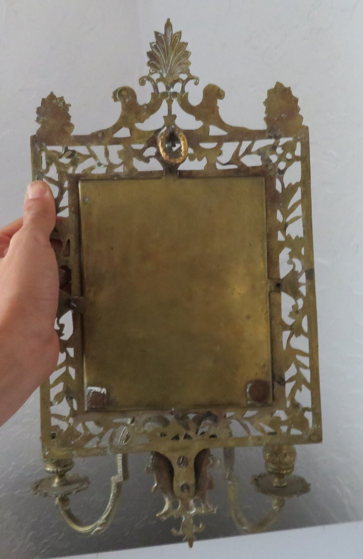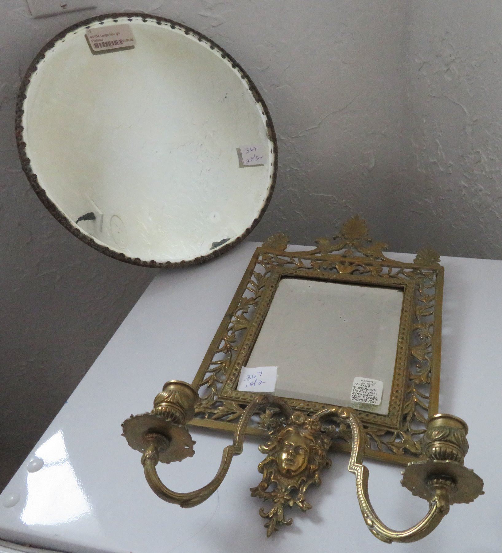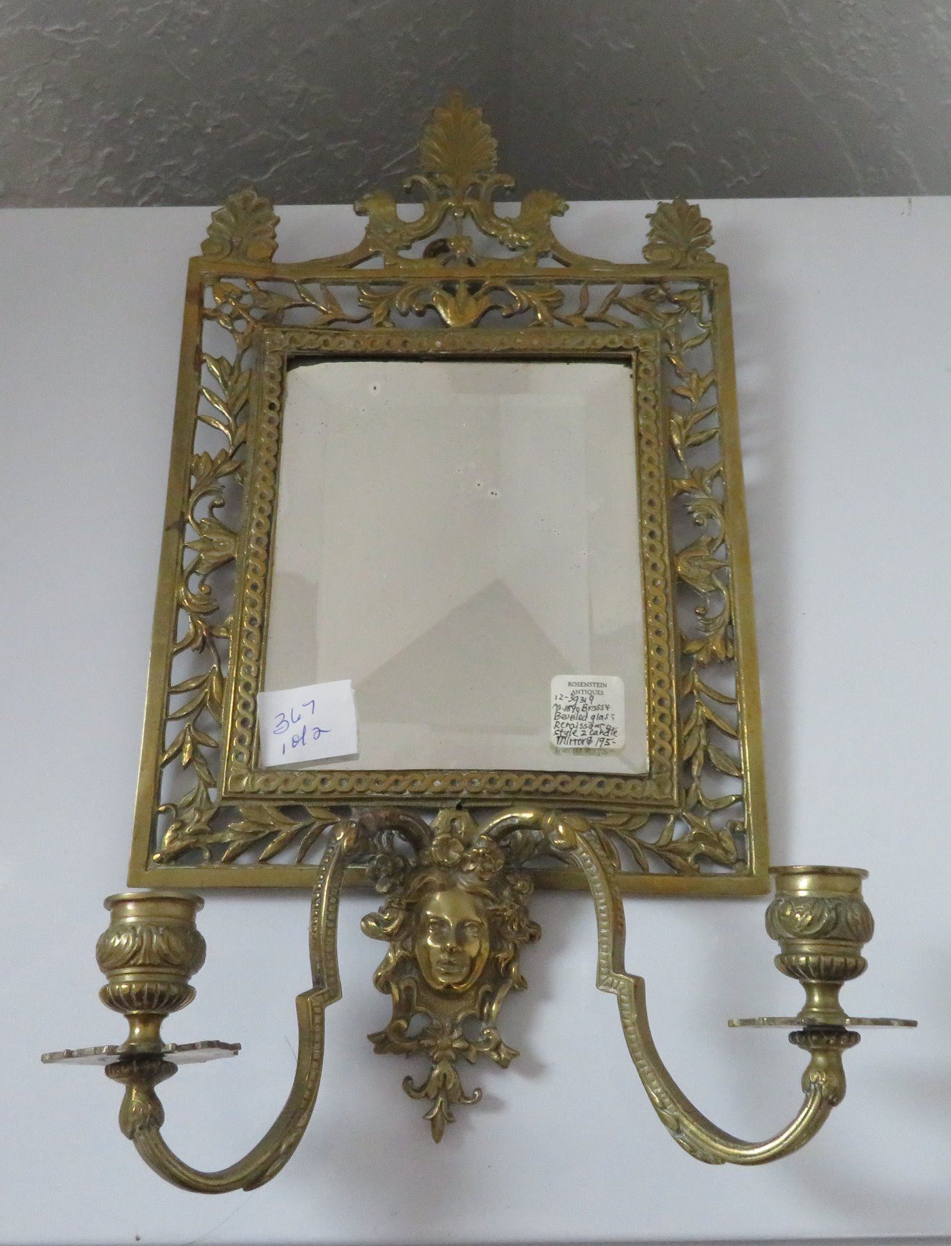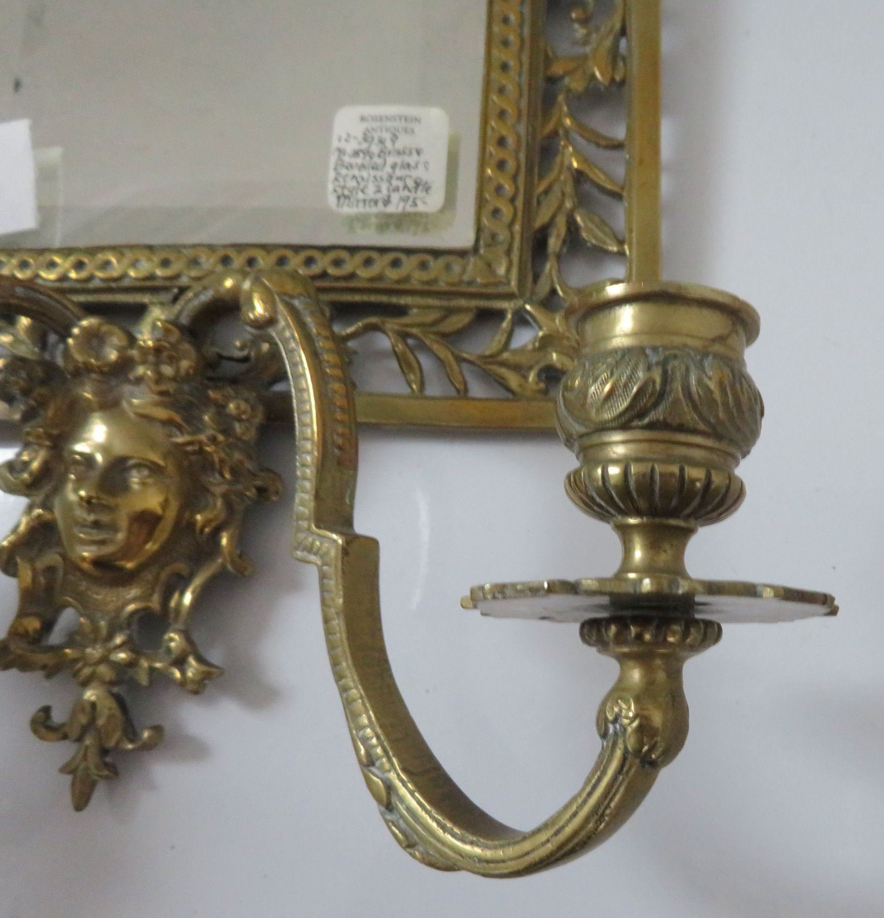 2 Bronze Mirrors, c. 1890s and later. Made of bronze and beveled glass, the items measure 8 1/4" x 16 1/2" x 4 1/2", and 11 15/16" x 3/4". European. Nice bronze, candlestick holder with beveled glass mirror. Condition: Glass is pitted on one, nice patina, see images. Shipping: $50.00 USA estimate only, double-boxed, due to heavy weight and value.