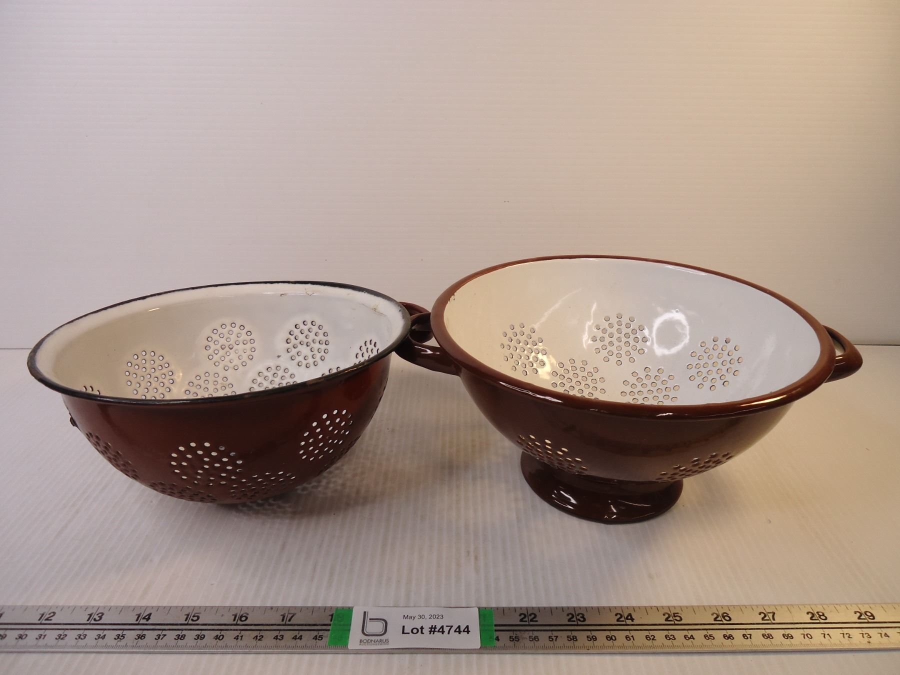 (2) Brown Enamelware Colanders- Missing a Handle on One.
