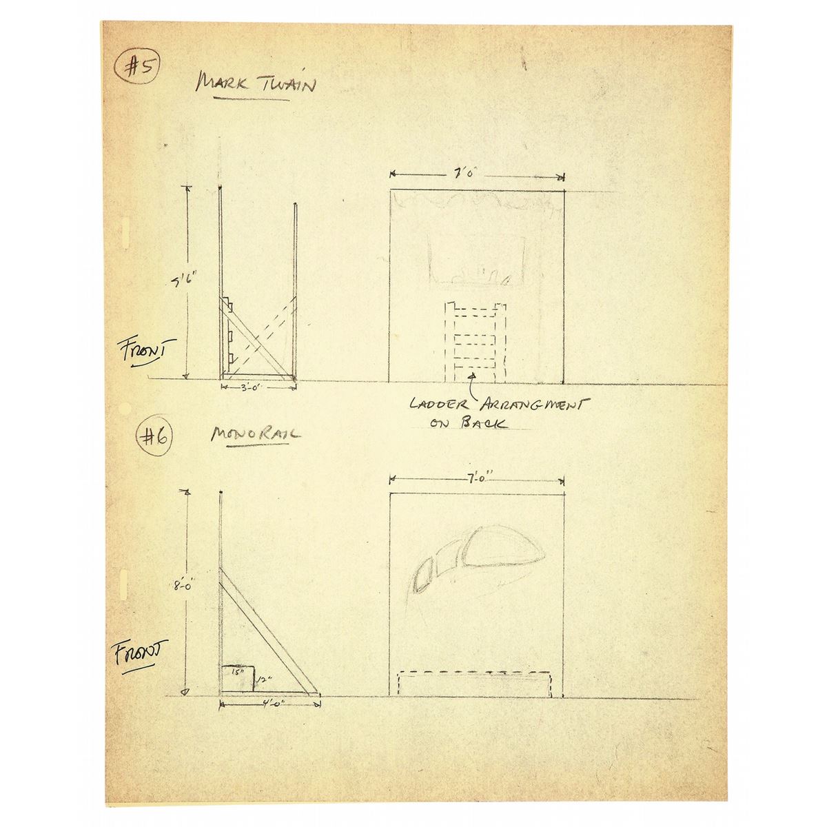 (Disneyland, 1959) These (2) 12.5”x15.5” brownlines were used for reference during construction of the Monorail, Mark Twain, and a Circus themed display at Disneyland’s Art Corner. In very good condition, with some discoloration as is normal with these types of materials.