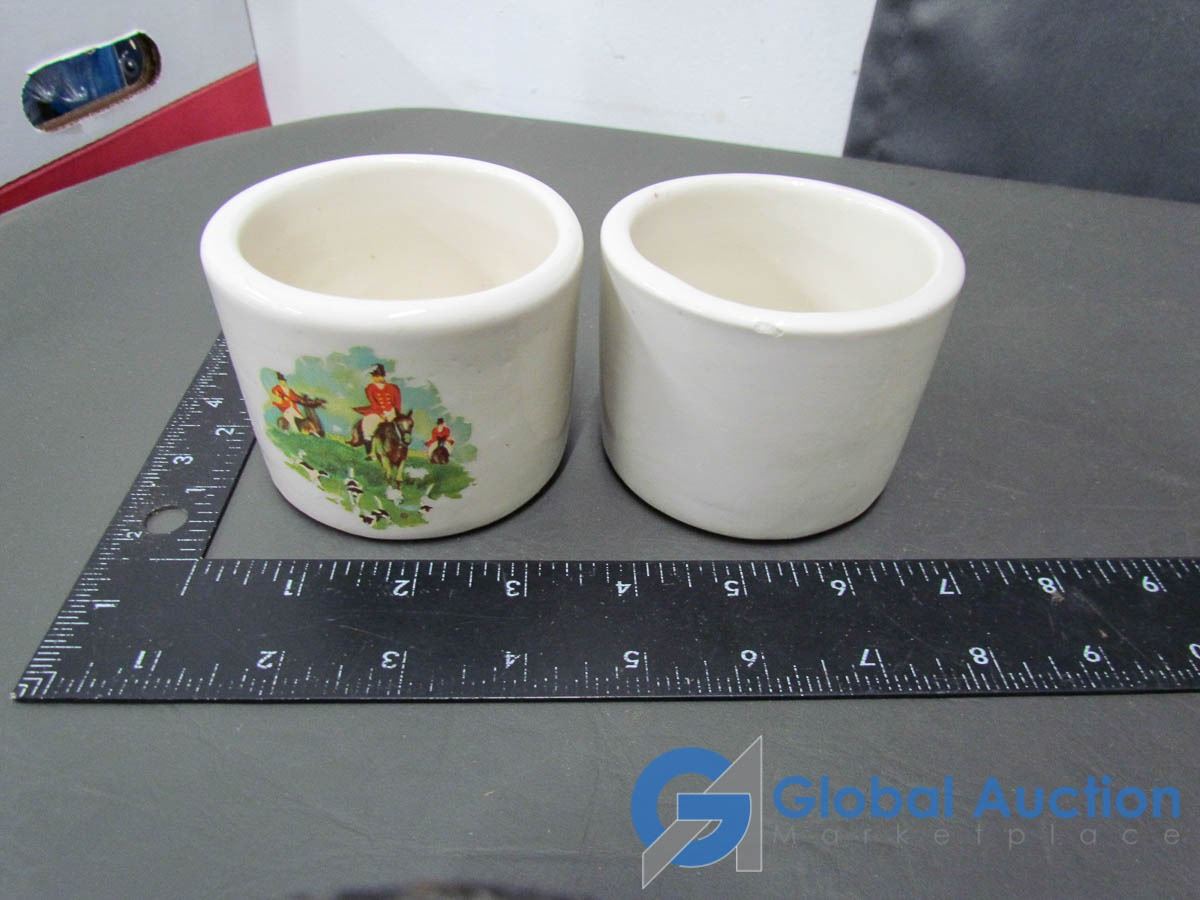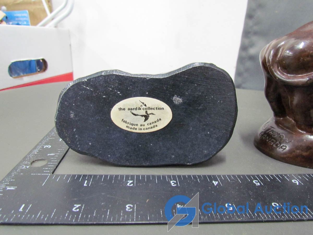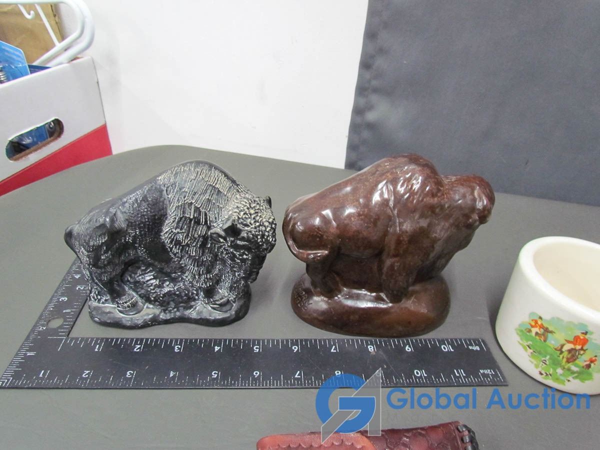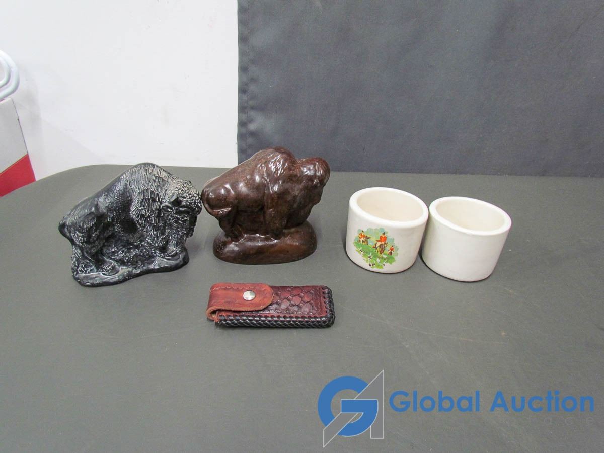 (2) Buffalo Statues, (2) Horse Relates Stoneware Cups and a Leather Sheath