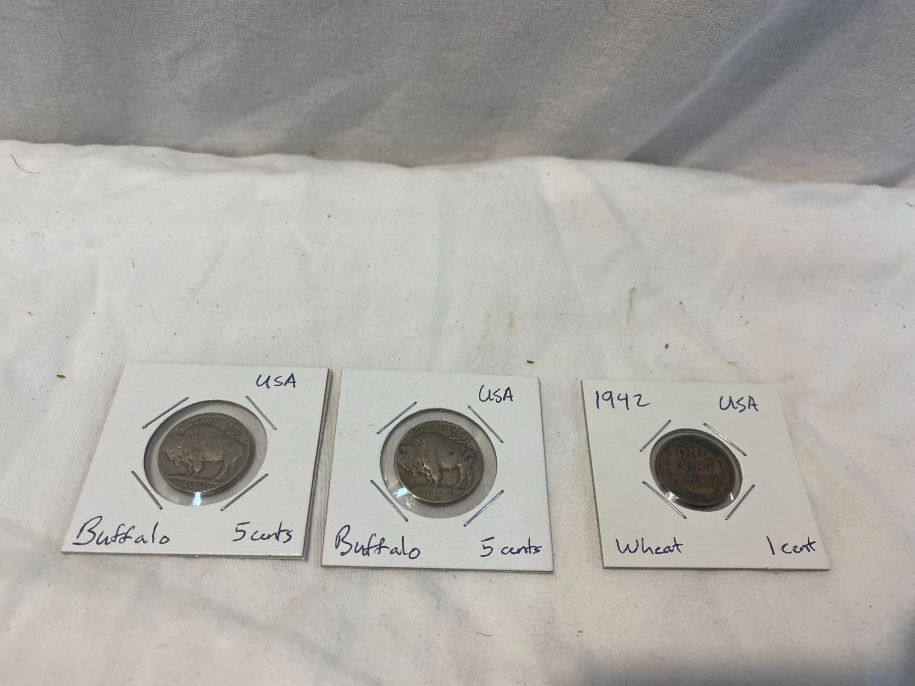 2 Buffalo nickels abs one wheat cent