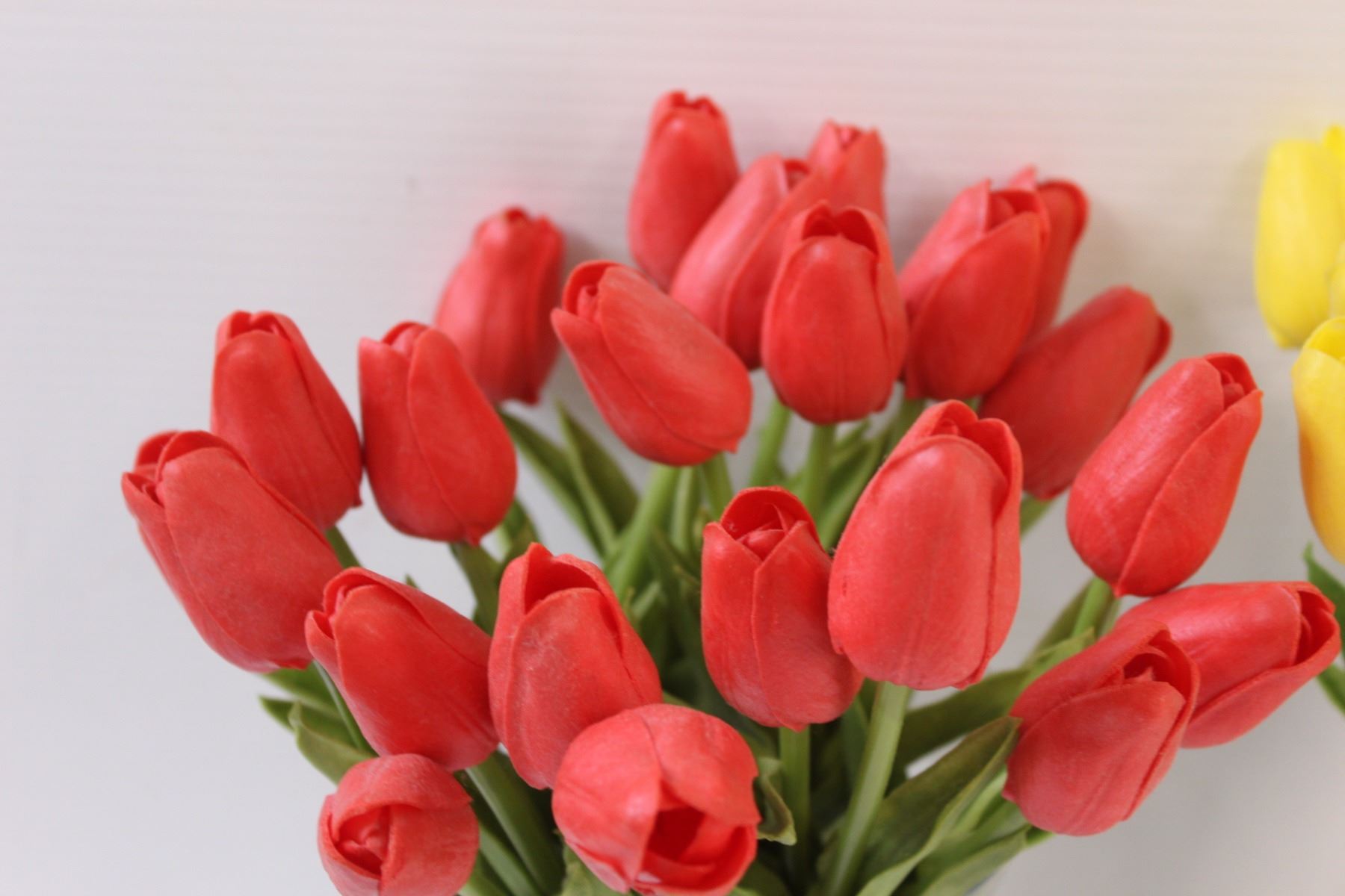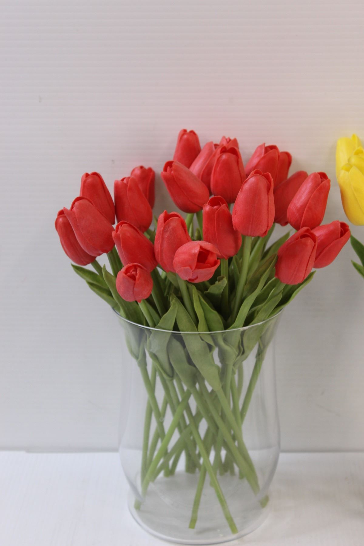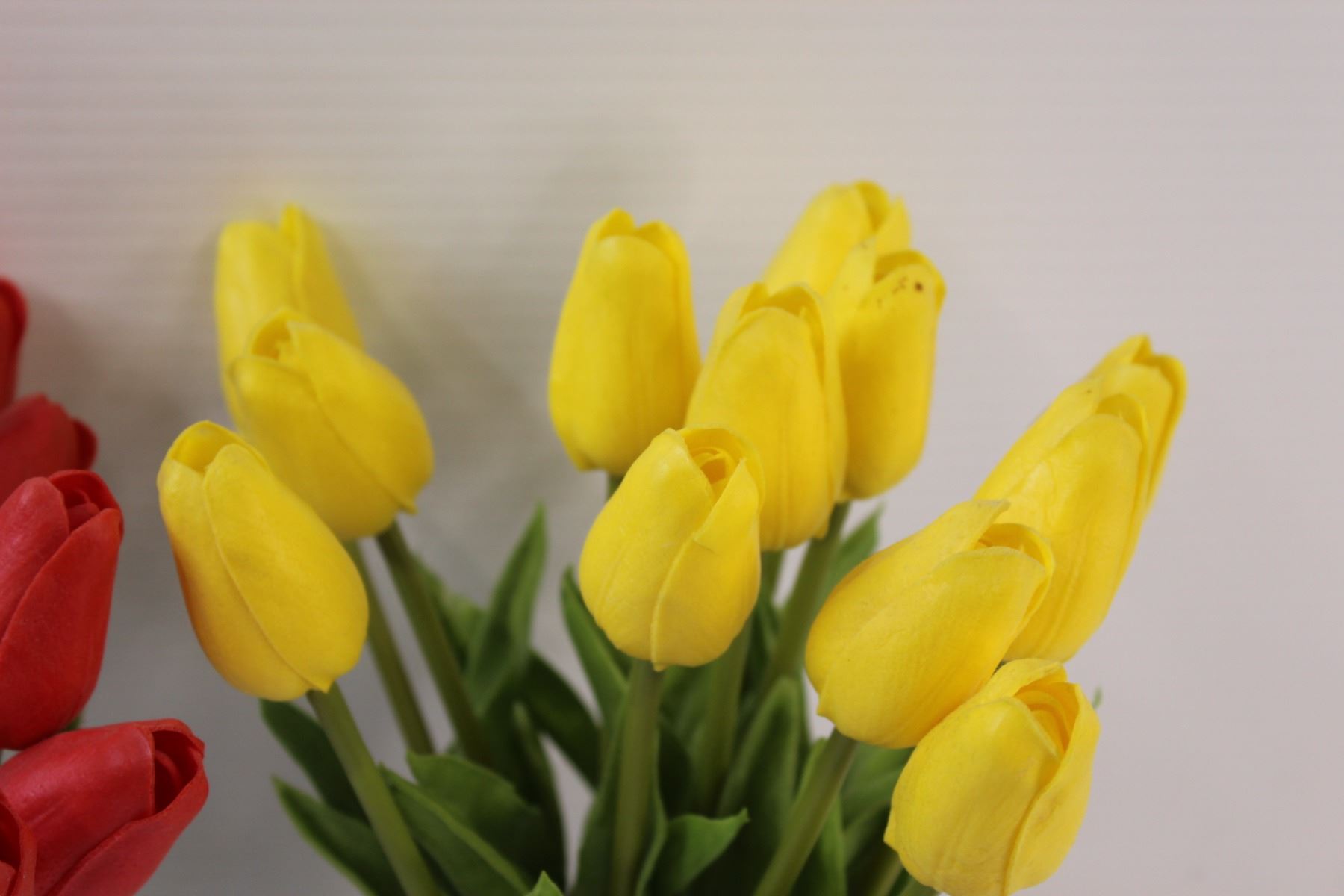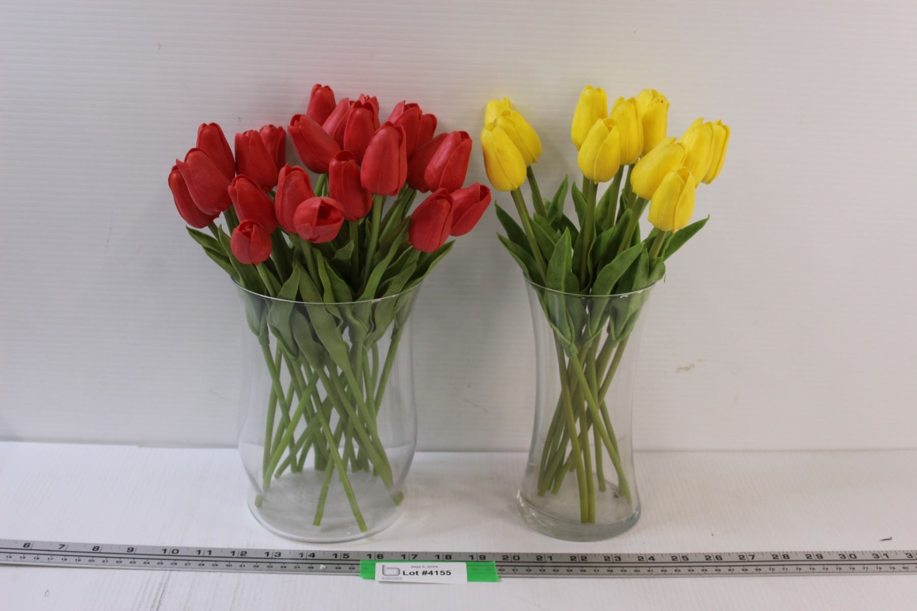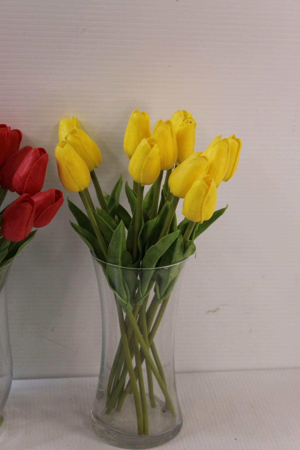 (2) Bunches of Faux Tulips (Red & Yellow) in Glass Vases - 14" Tall Tulips