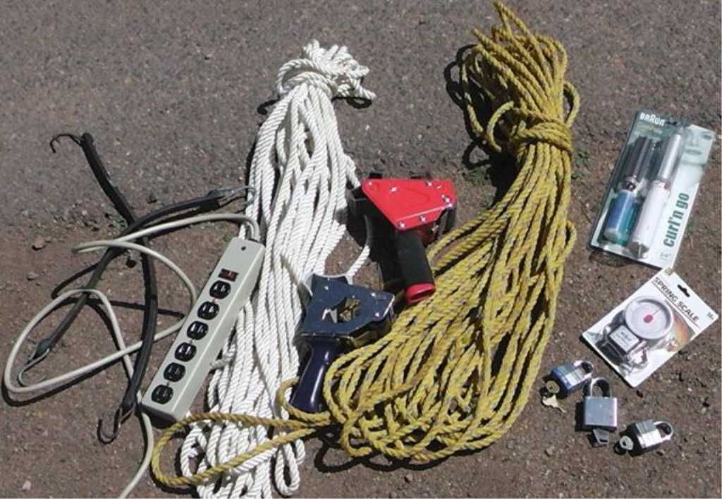 2 Bundles of Rope, 2 Tape Dispensers, 3 Locks, Scale, 6-way plug, and a Cordless Curling Iron