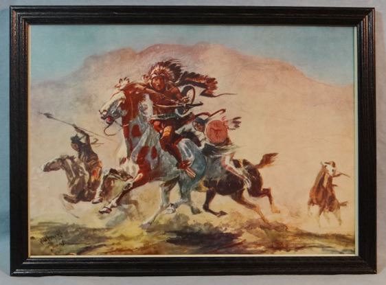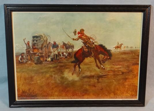 2 C. M. Russell prints, Riders of The Rough String and Redskin Raiders, 9" x 14" each, framed