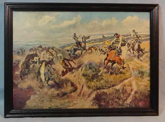 2 C. M. Russell prints, Tight Dally and Loose Latigo and untitled, 9" x 14" each, framed
