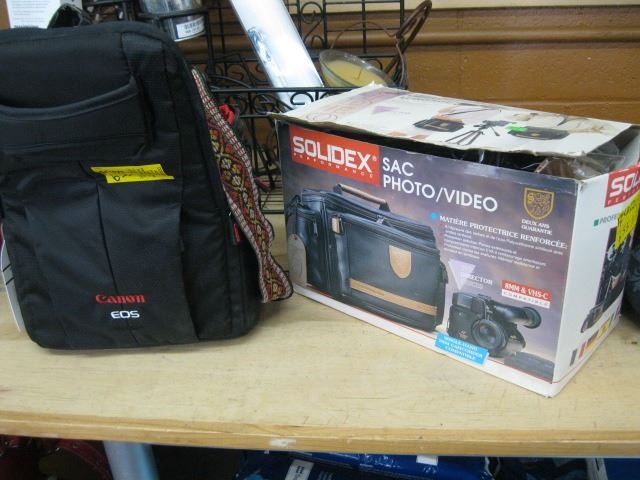 2 CAMERA BAGS, CAMERA, CANNON LENS, VIVITAR FLASH, ETC.