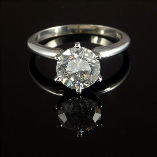 ENGAGEMENT RING: Classic 14K white gold and diamond solitare engagement ring. Round brilliant diamond measures approximately 2.20 cts, has I2 clarity and E to F color. Appraisal included.