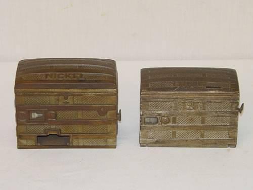 (2) CAST IRON TRUNK FORM REGISTERING BANKS: DIME BANK 1891 & NICKEL BANK 1888 - WEAR & IMPERFECTIONS;