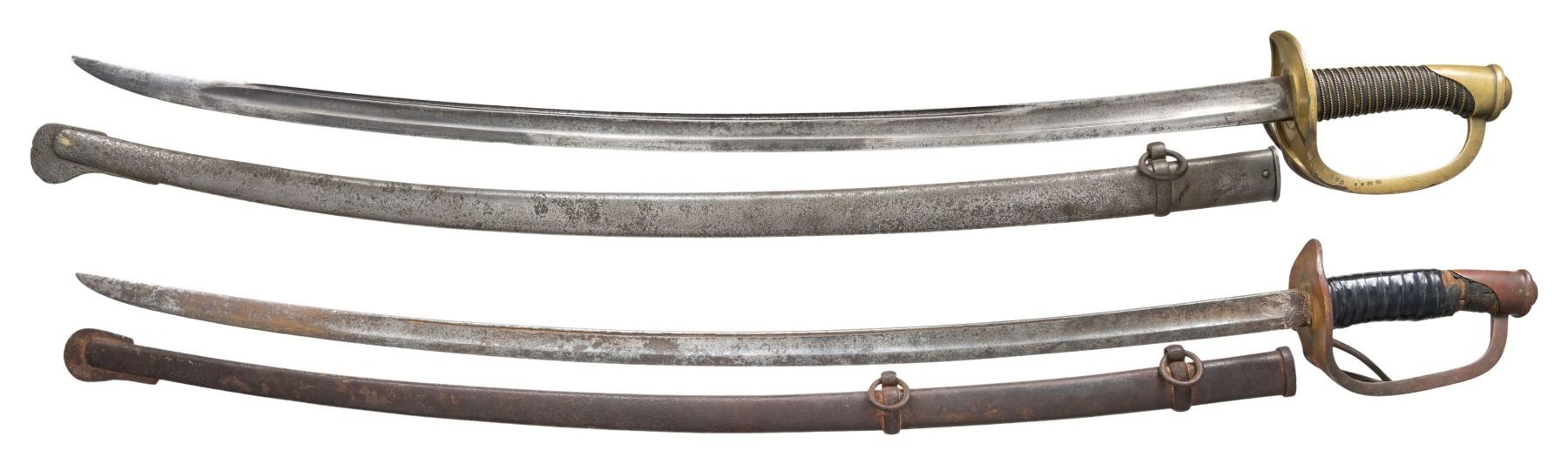 1) An US M1860 enlisted cavalry saber measuring 43 1/4" overall with a plain 35" blade. The blade has a single large fuller with a secondary fuller near the spine. The ricasso is pitted but appears to be marked "EMERSON & SILVER TRENTON NJ" & "U.S D.F.M 1864". Brass semi-basket guard with a wire wrapped leather grip. Iron scabbard. CONDITION: blade has a dark oxidized patina, and the hilt has a deep and somewhat crusty patina. The grip has traces of leather remaining but has been wrapped in electrical tape. Scabbard has a dark oxidized patina. 2) A good example of an French import US M1840 style enlisted cavalry saber measuring 43 1/2" overall with a 34" plain blade with a single large fuller and a secondary fuller near the spine. The spine of the blade has French markings giving the model as 1822 and the date of manufacture as 1879. Plain brass hilt with semi-basket 2 branch guard and wire wrapped leather grip. Iron scabbard. CONDITION: blade has a light gray patina with some staining and the hilt has a mellow brass patina. Grip and wire are complete. Scabbard has a medium gray patina.(02-24095/BF). NON-GUN. $450-650.