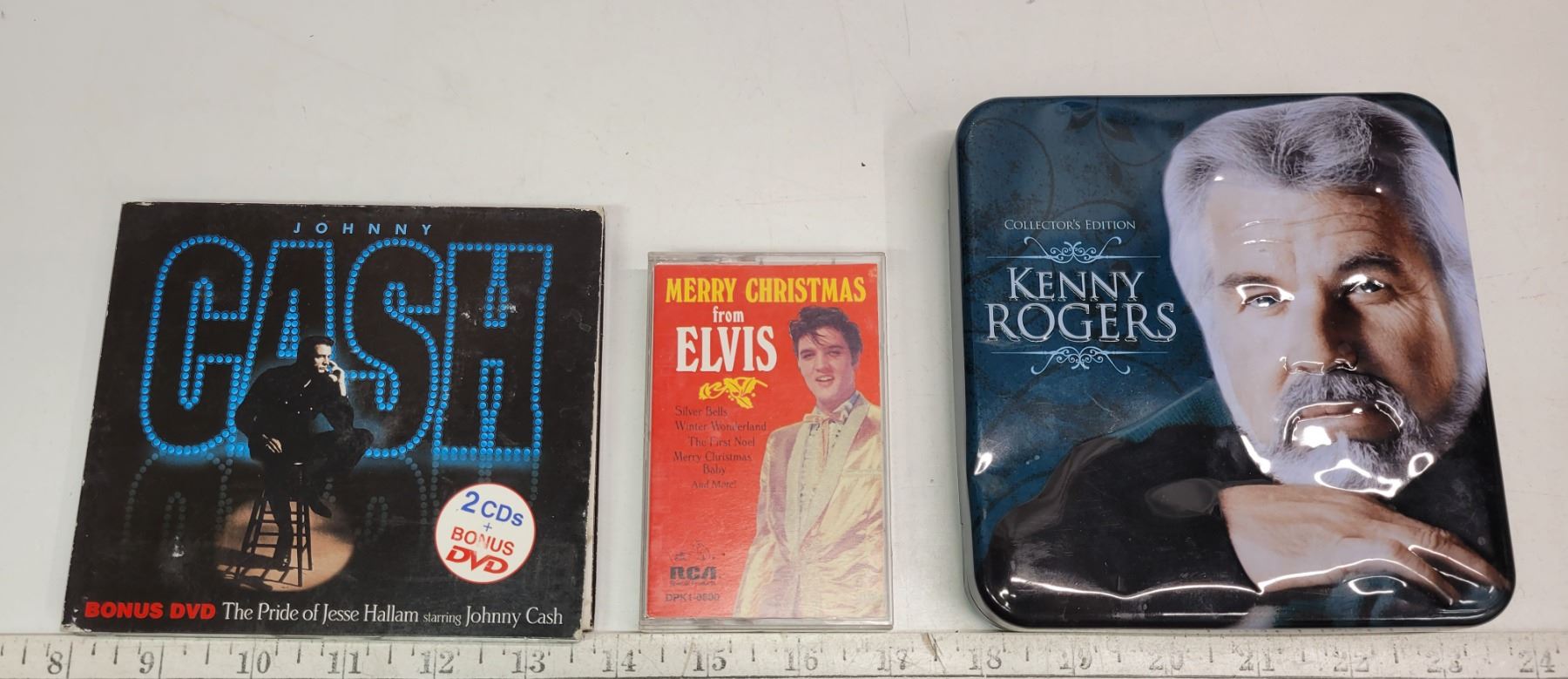 2 CD sets; Johnny Cash and Kenny Rogers and Elvis Cassette