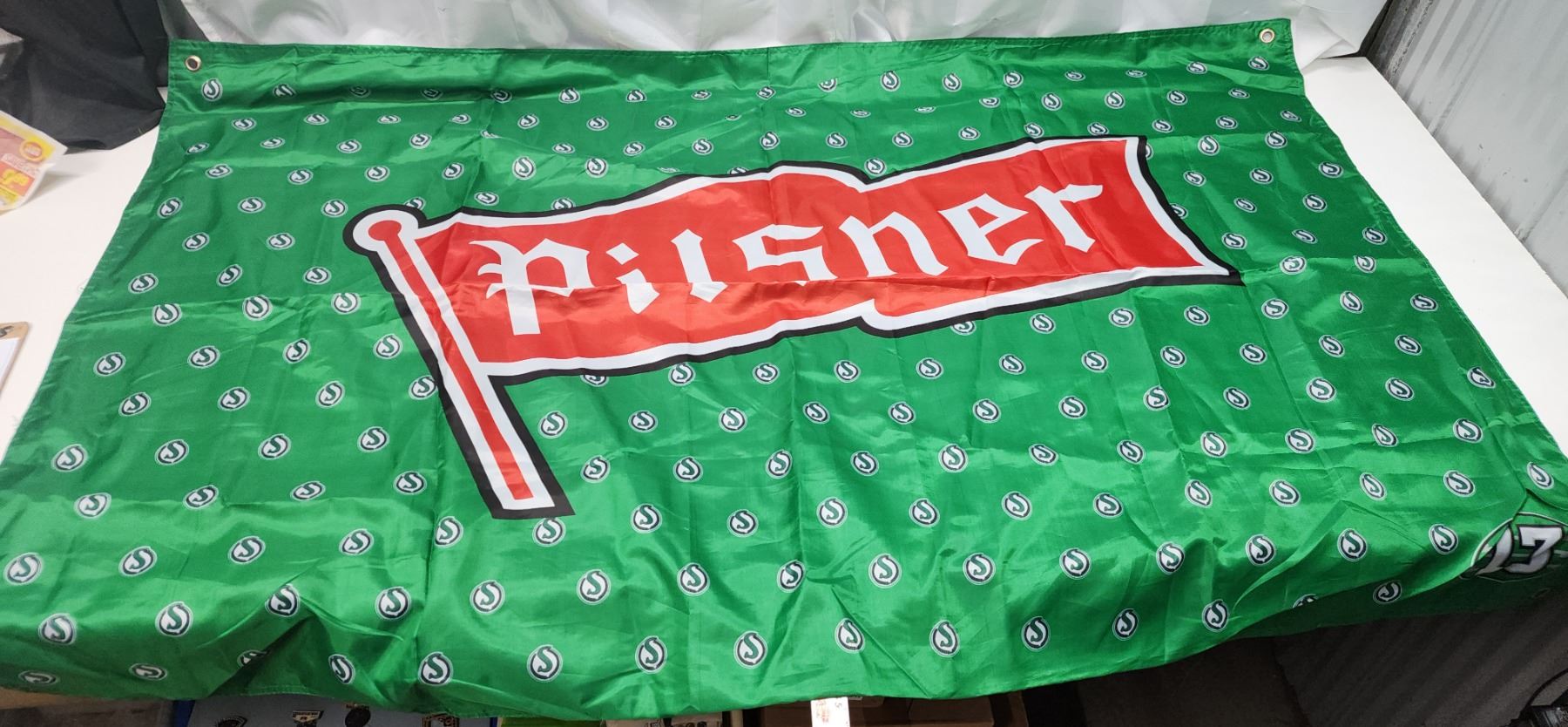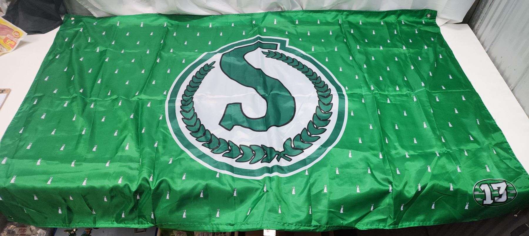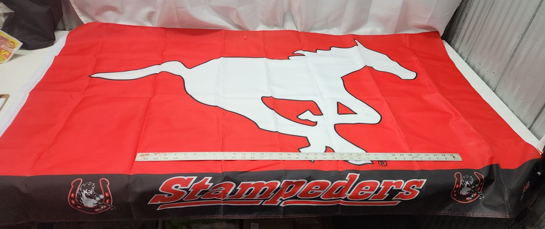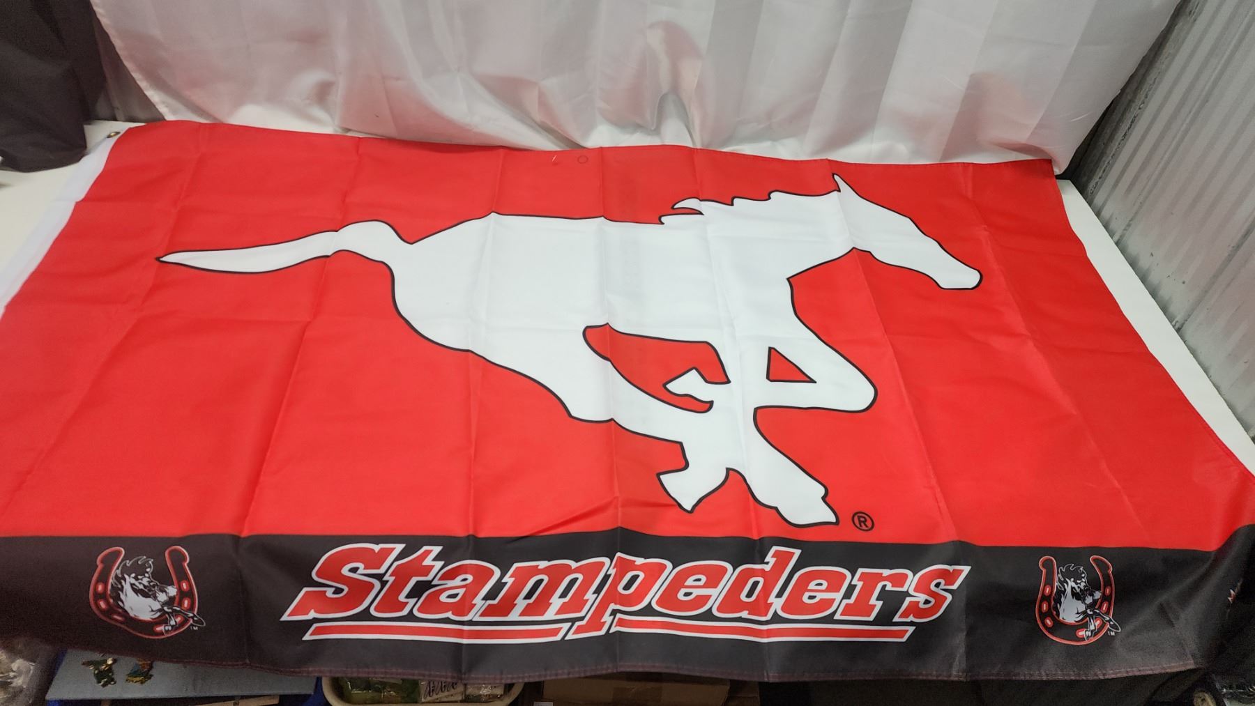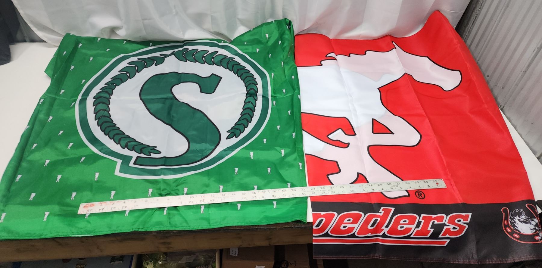 2 CFL flags - Rough Riders/Pilsner & Calgary Stampeder's - like new