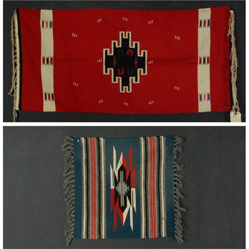 WEAVING: Two Chimayo-style weavings of aniline-dyed machine spun wool, one with cadet blue ground, the other with a deep red ground. Mid 20th c. 48'' x 22.5'' & 19'' x 18''