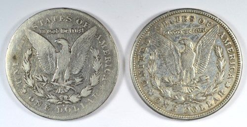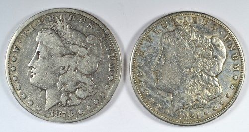 ( 2 ) CIRCULATED MORGAN SILVER DOLLARS, 1878-S AND 1921-S