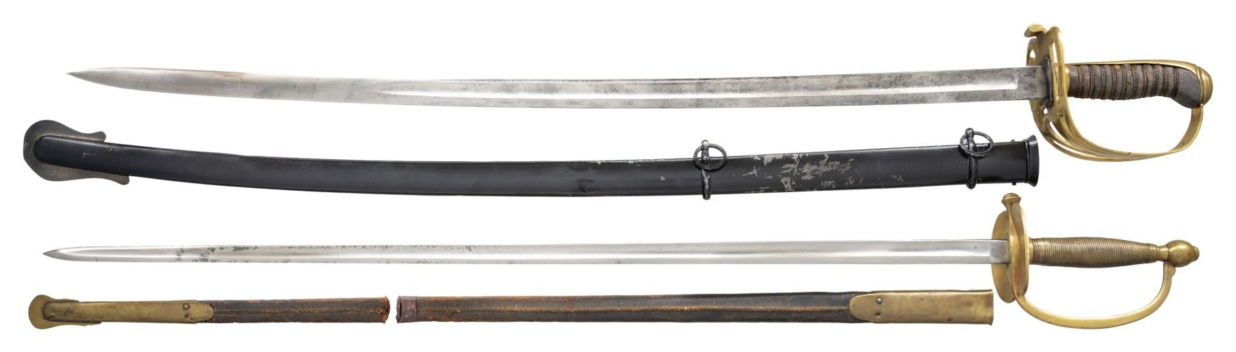 1) NCO. A good example of a Civil War period US M1840 NCO sword measuring 39 1/4" overall with a plain 32 1/4" single fullered blade. The blade is marked at the ricasso "A.H.K". Solid brass hilt and brass mounted leather scabbard. CONDITION: blade and hilt show very light wear. Scabbard shows moderate wear and has a break 12 1/2" up from the tip. 2) FOOT OFFICER. A fine example if a non-regulation foot officer's saber measuring 40 1/2 overall with an etched 31 7/8" blade. The blade is etched with foliate, patriotic, and military motifs, and the ricasso is stamped "W. CLAUBERG (knight) SOLINGEN". Gilded brass hilt with a pierced basket guard featuring a cutout eagle and the letters "U S". Wire wrapped sharkskin grip and black painted scabbard. CONDITION: blade and hilt show light wear. Scabbard may have been repainted black quite a while ago. (02-24262-1/BF). NON-GUN. $600-900.
