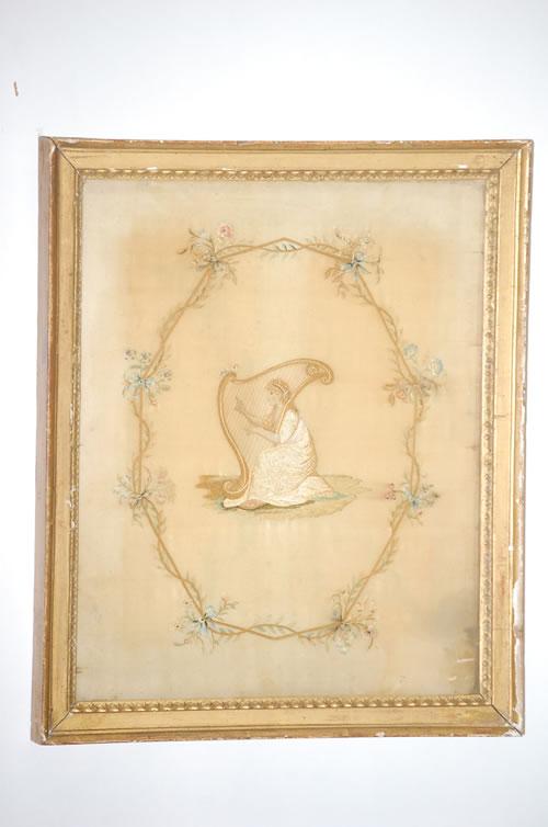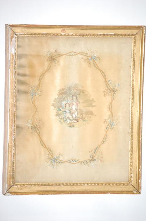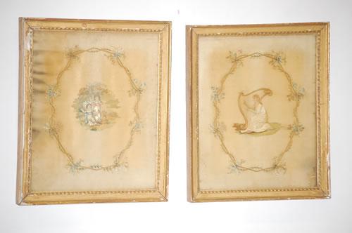(2) CLASSICAL SILK EMBROIDERIES - (2) 18TH-EARLY 19TH CENT. SILK NEEDLEWORK EMBROIDERIES: CHILDREN W/ BASKET OF CHERRIES & WOMAN PLAYING THE HARP-BOTH IN RIBBONED FLORAL WREATHS IN GILT FRAMES (16" X 13")-WEAR, TONING & STAIN, LOSSES, IMPERFECTIONS