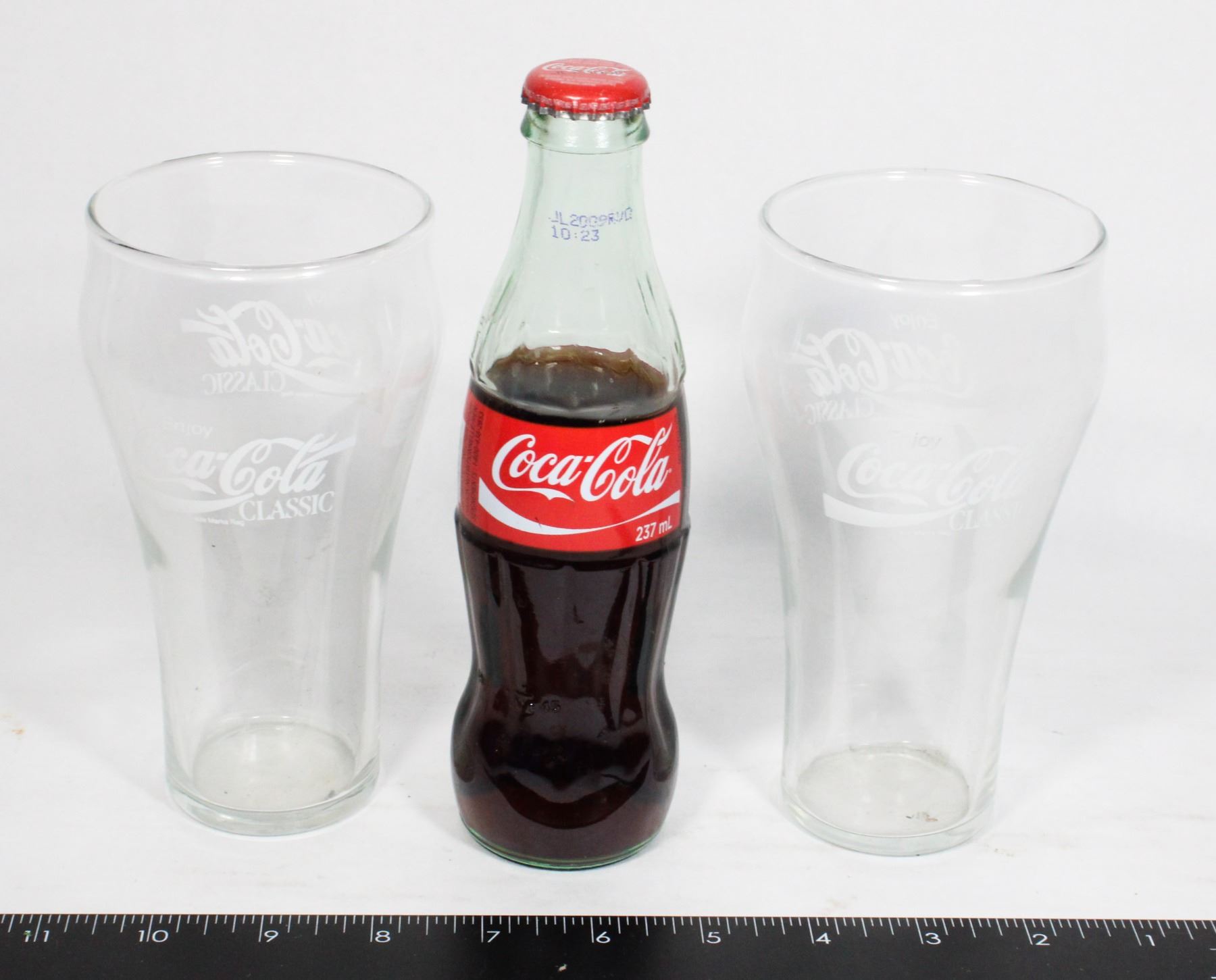 2 COCA COLA GLASS CUPS AND SEALED BOTTLE FROM