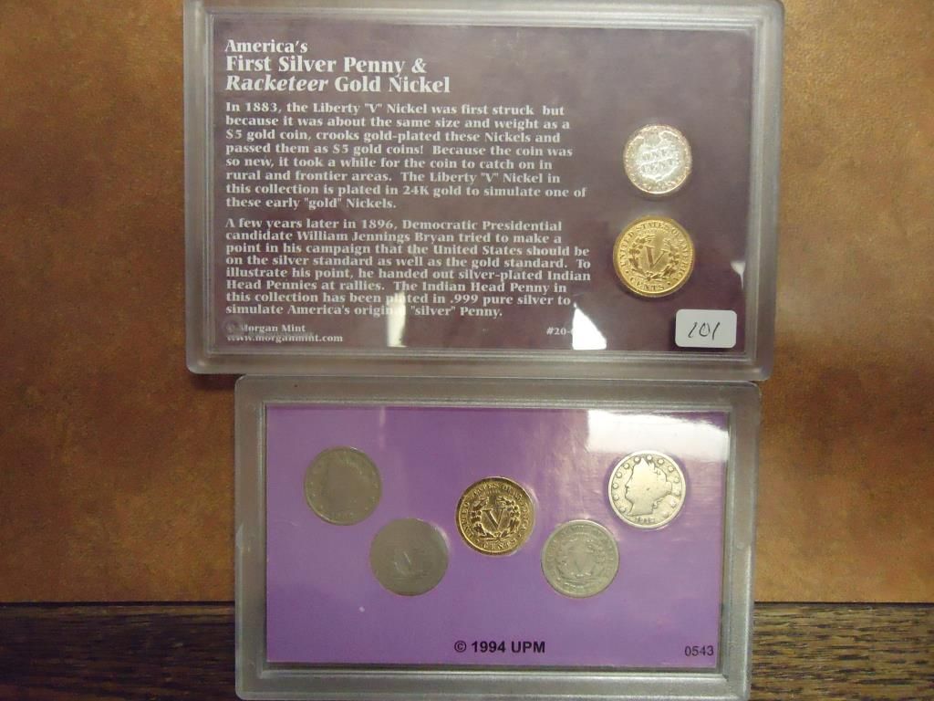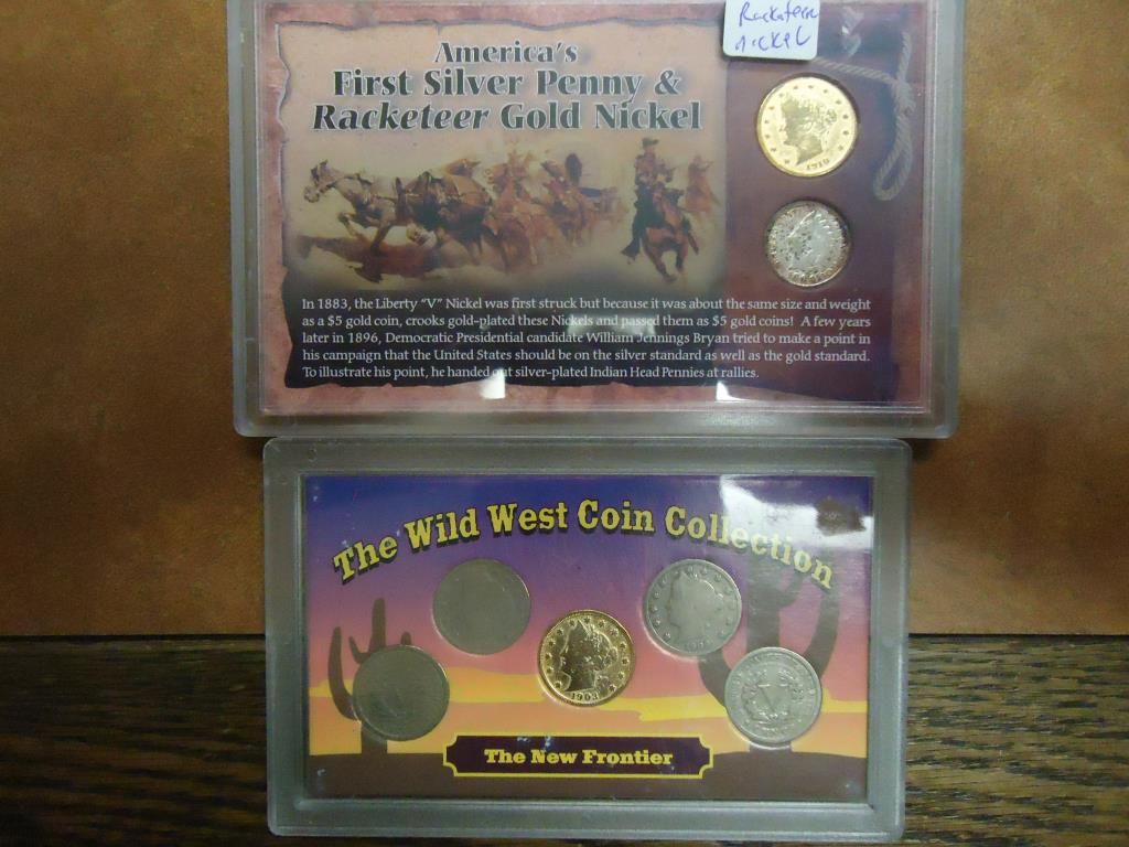WILD WEST CONTAINS: 5 LIBERTY "V" NICKELS AND A SET THAT CONTAINS: A INDIAN HEAD CENT AND LIBERTY "V" NICKEL, THE INDIAN HEAD CENT IS SILVER PLATED. BOTH OF THE LIBERTY "V" NICKELS ARE RACKATEER NICKELS