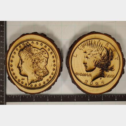 MORGAN DOLLAR AND PEACE DOLLAR THEMED. CAN ALSO BE USED AS A WALL PLAQUE DECORATION. EACH IS COATED IN 3 COATS OF POLYURETHANE AND MEASURE 4.5" X 4.25".