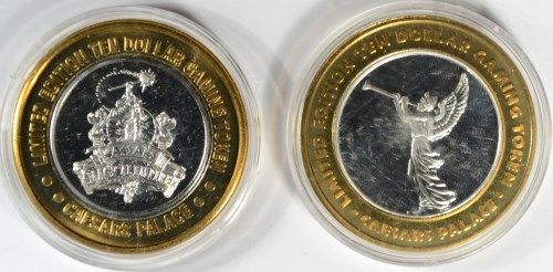 GET THESE TWO NICE TOKENS, EACH CONTAINING .6 OUNCES OF .999 SILVER EACH, TWO DIFFERENT CAESARS PALACE, EST. $65.00 TO $70.00 SILVERTOWNE AUCTIONS IS PROUD TO BE A TOP RANKED AUCTION ON PROXIBLOG RATING OF ONLINE AUCTIONS