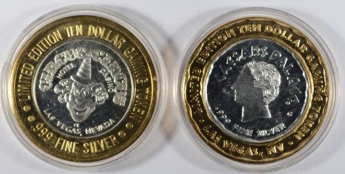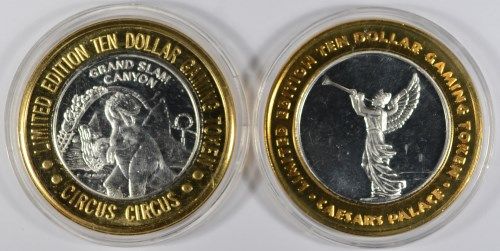 GET THESE TWO NICE TOKENS, EACH CONTAINING .6 OUNCES OF .999 SILVER EACH, CAESARS PALACE AND CIRCUS CIRCUS, EST. $65.00 TO $70.00 SILVERTOWNE AUCTIONS IS PROUD TO BE A TOP RANKED AUCTION ON PROXIBLOG RATING OF ONLINE AUCTIONS
