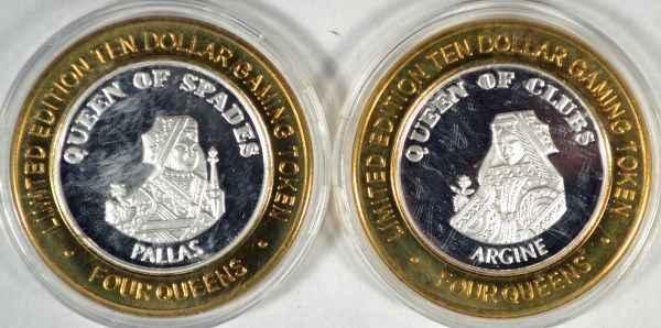 GET THESE TWO NICE TOKENS, EACH CONTAINING .6 OUNCES OF .999 SILVER EACH, THE QUEEN OF CLUBS AND THE QUEEN OF SPADES FROM THE FOUR QUEENS CASINO, EST. $65.00 TO $70.00 SILVERTOWNE AUCTIONS IS PROUD TO BE A TOP RANKED AUCTION ON PROXIBLOG RATING OF ONLINE AUCTIONS