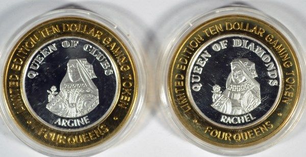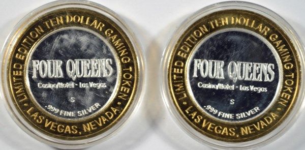 GET THESE TWO NICE TOKENS, EACH CONTAINING .6 OUNCES OF .999 SILVER EACH, TWO DIFFERENT FROM FOUR QUEENS CASINO, EST. $65.00 TO $70.00 SILVERTOWNE AUCTIONS IS PROUD TO BE A TOP RANKED AUCTION ON PROXIBLOG RATING OF ONLINE AUCTIONS