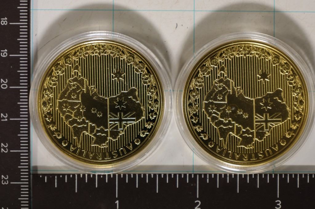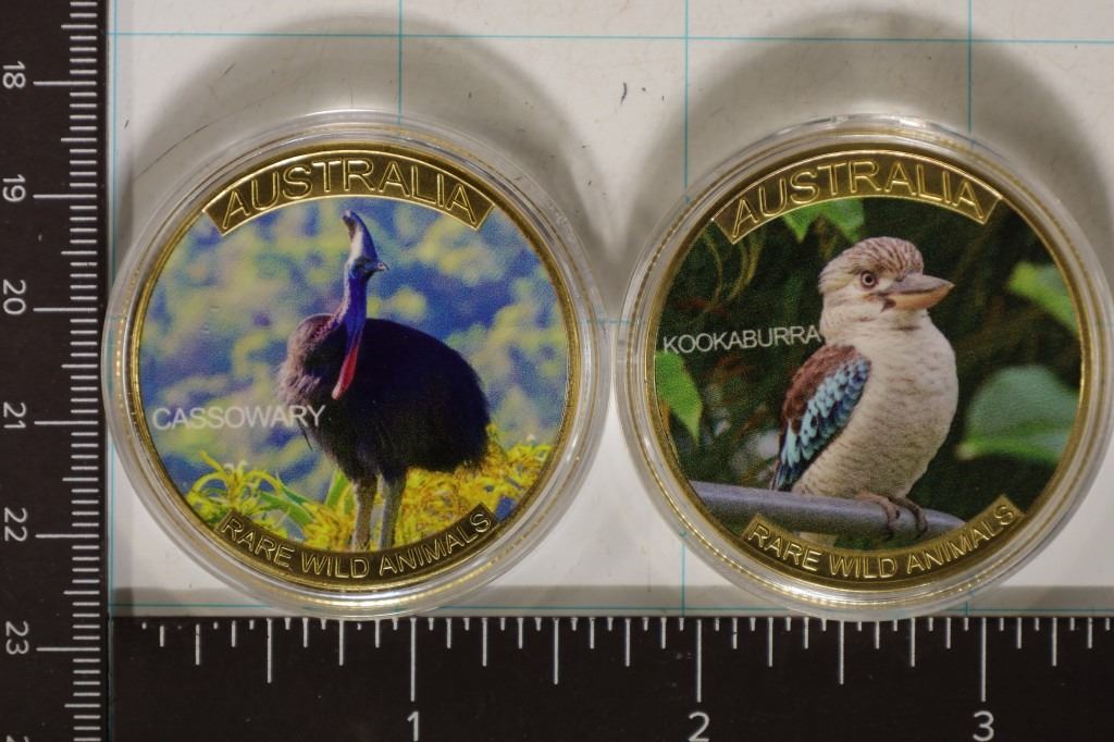 PLATED TOKENS: THE AUSTRALIA KOOKABURRA AND CASSOWARY. IN HARD PLASTIC CAPSULES