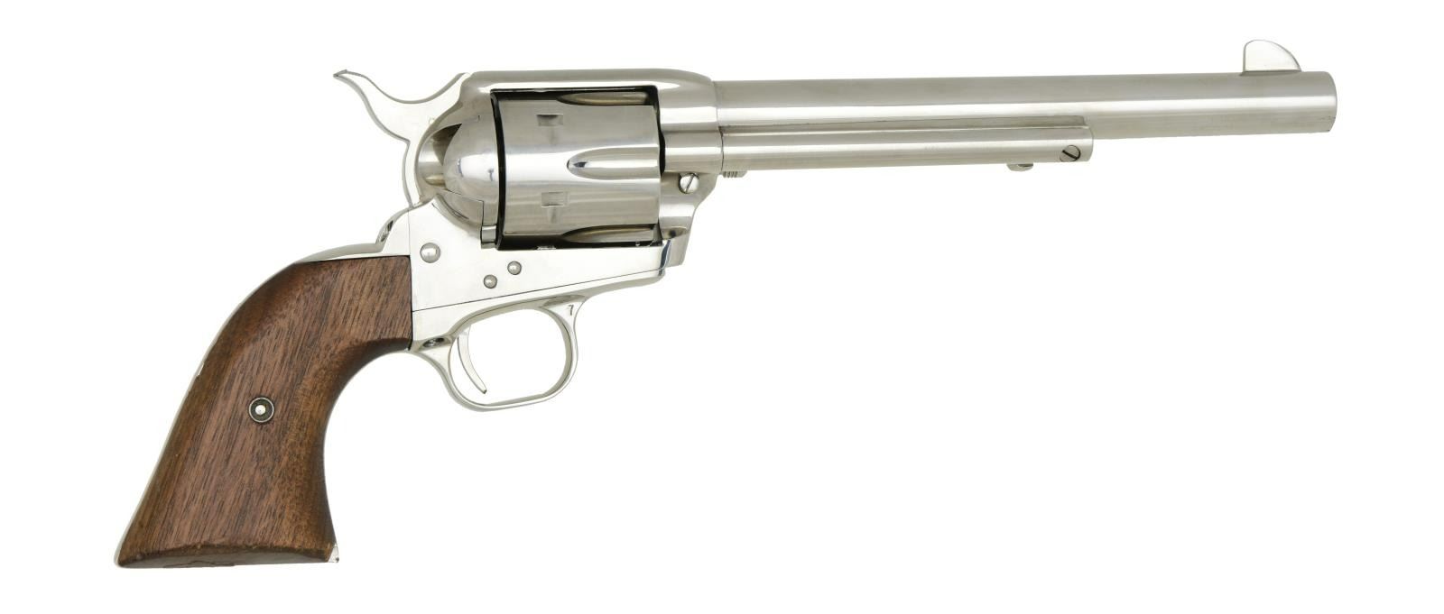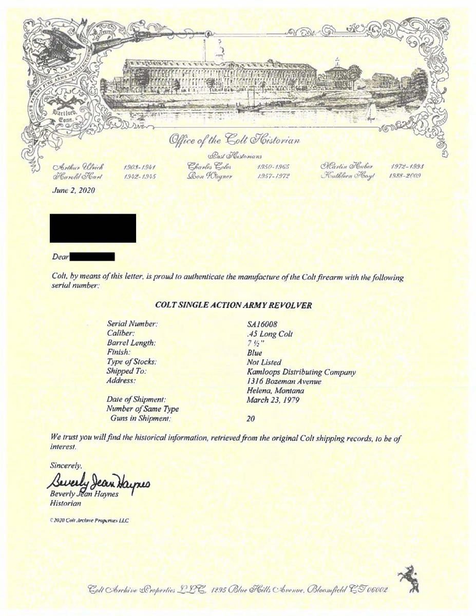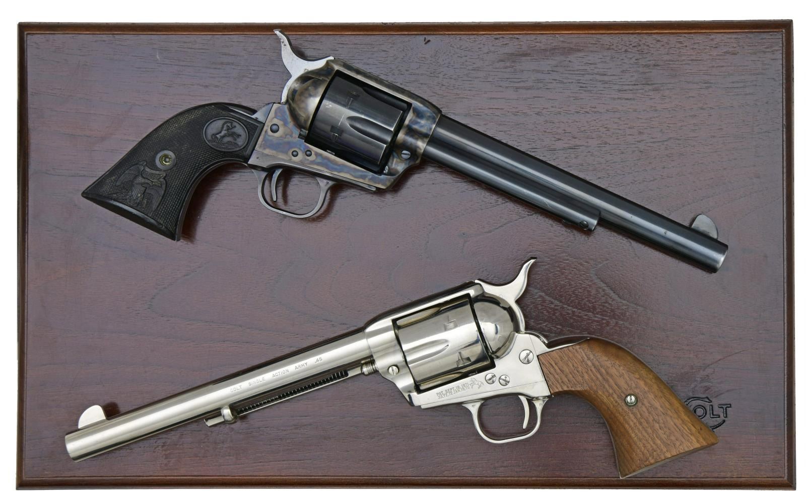 1) Cal 45 Colt. S# SA16008. Bbl. 7 1/2". Six shot fluted cyl. Blue & case colored finish. 2 piece checkered plastic eagle grips. UNATTACHED ACCESSORIES: revolver is housed in a Colt marked presentation case w/ red velour fitted interior. Case contains key, letter from the Office of the Colt Historian detailing the following information: "Serial Number: SA16008, Caliber: .45 Long Colt, Barrel Length: 7 1/2", Finish: Blue, type of stocks not listed, shipped to Kamloops Distributing Company, address: 1316 Bozeman Avenue Helena, Montana. Date of shipment: March 23, 1979. Number of same type guns in shipment: 20. CONDITION: over 80% blue showing carry & edge wear. Frame retains over 90% case colors. Polished sides of hammer show spots of tarnish. Grips show scratches & marks. Sound mechanics. Very good bore. PROVENANCE: from The Collection of Gun Sport Ltd owned by Jon R. Thomas. 2) Cal 45 Colt. S# SA03911. Bbl. 7 1/2". Six shot fluted cyl. Full nickel finish. 2 Piece walnut grips. UNATTACHED ACCESSORIES: revolver is housed in a Colt marked presentation case w/ red velour fitted interior. Case contains key, letter from the Office of the Colt Historian detailing the following information: "Serial Number: SA03911, Caliber: .45 Long Colt, Barrel Length: 7 1/2", Nickel finish, type of stocks: Not Listed, shipped to: Berenson Hardware Company, Address: 2625 NW Industrial Avenue Portland, Oregon. Date of shipment May 4, 1979. Number of same type guns in shipment is 1. CONDITION: 98% nickel finish showing scratches & marks w/ a light cyl. drag line. Grips show heavy scratches & marks w/ chips along butt of right panel. Sound mechanics. Very good bright bore. PROVENANCE: from The Collection of Gun Sport Ltd owned by Jon R. Thomas. (23-4451, 23-4452/DS). BOTH MODERN. $2,500-3,500.