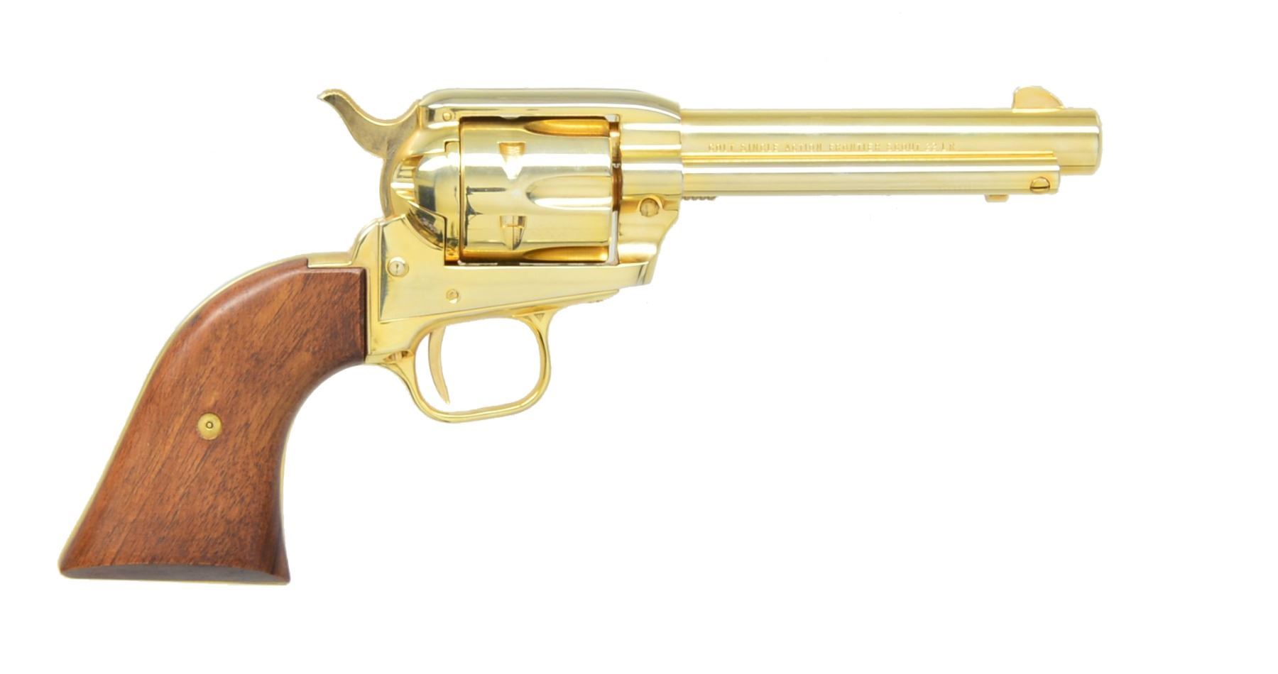 COMMEMORATIVE SA REVOLVERS. BOTH: cal. 22 LR. Bbls. 4 3/4". Full gold anodized finish w/ 2 piece walnut grips. Limited edition 6,201 mfg. 1961. UNATTACHED ACCESSORIES: both guns housed in wood display cases w/ red fitted interiors having Kansas Centennial medallions on lid. 1) S# 3687G. CONDITION: appears unfired, gold anodizing shows fading on back strap & ejector. (20-93/DS). 2) S# 1419G. CONDITION: appears unfired, gold anodizing shows areas of fading & spots on bbl., cyl., frame & grip straps. (20-96/DS). BOTH CURIO. $900-1,300.