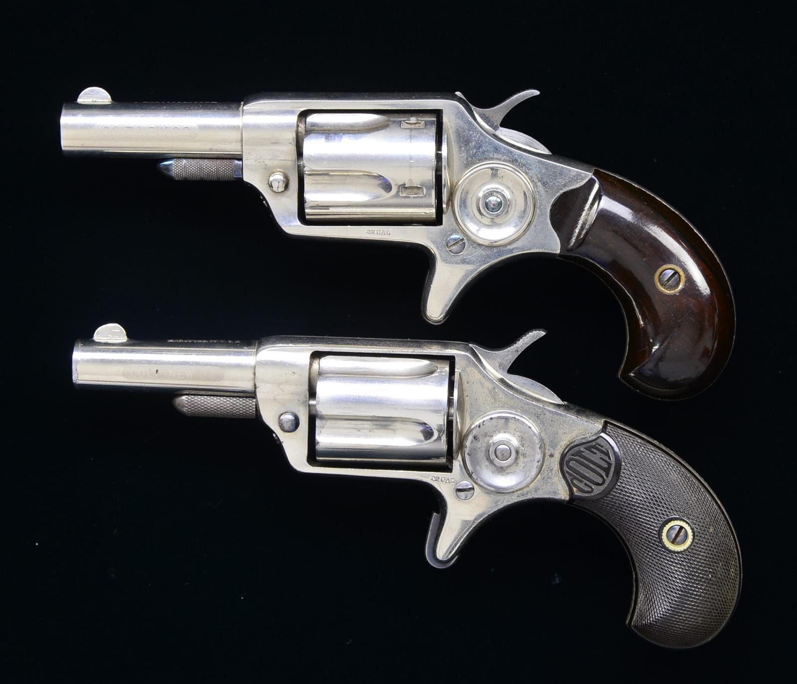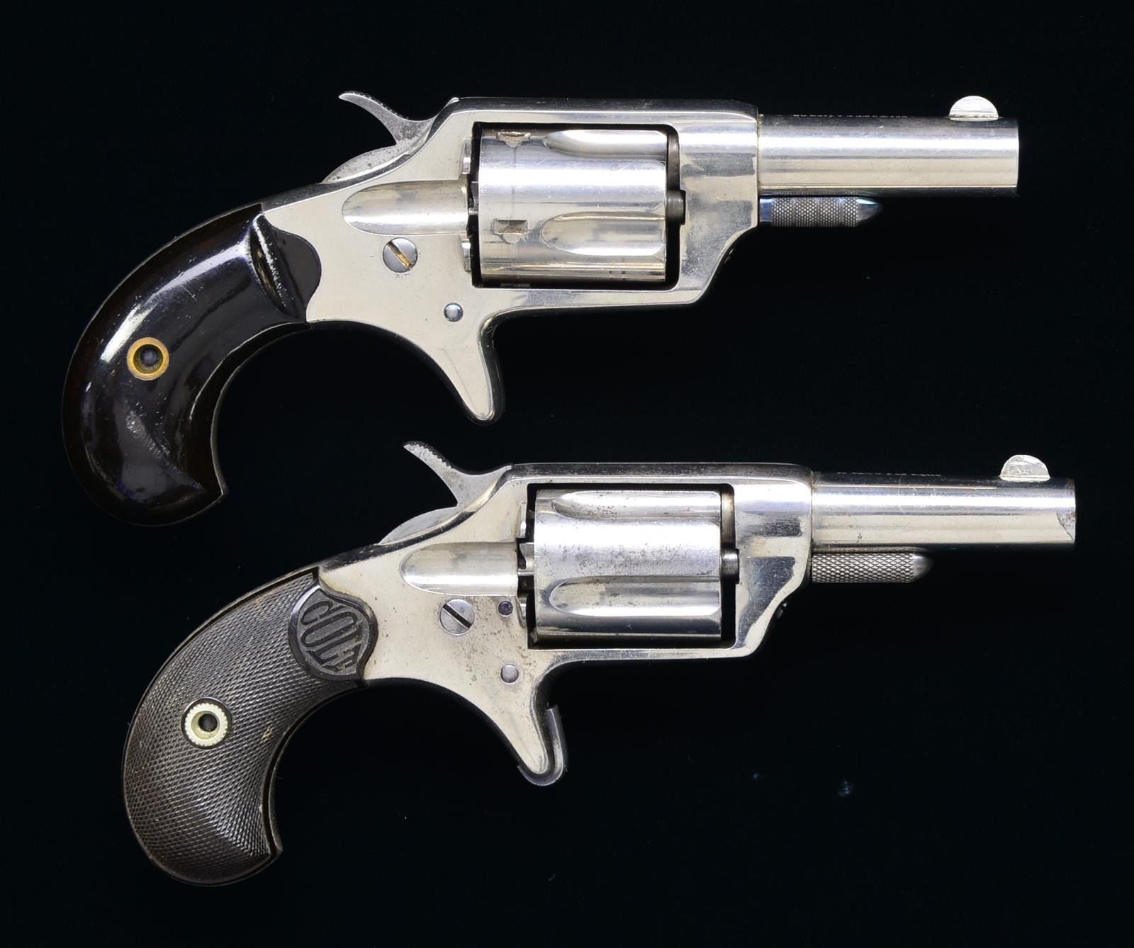 ALL: bbls. 2 1/4" rnd. w/ semicircular front sights & etched panel cal. markings. 5 Shot fluted cyls. Nickel finished spur trigger actions. 1) Cal. 32 Colt RF. S# 7190. 2 Piece bird's head rosewood grips. CONDITION: over 95% nickel w/ a slight cyl. drag line. Clear etched panel cal. marking. Grips show light wear. Crisp mechanics. Bright bore w/ strong rifling. (01-18107/DS). 2) Cal. 32 Colt CF. S# 16616. 2 Piece checkered hard rubber Colt marked bird's head grips. CONDITION: 75% nickel. Very good etched cal. marking. Grips show light wear. Sound mechanics. Bore retaining strong rifling showing spots of very light pitting. PROVENANCE: The Estate of Richard Willman. (01-18109/DS). ALL ANTIQUE. $750-1,100.
