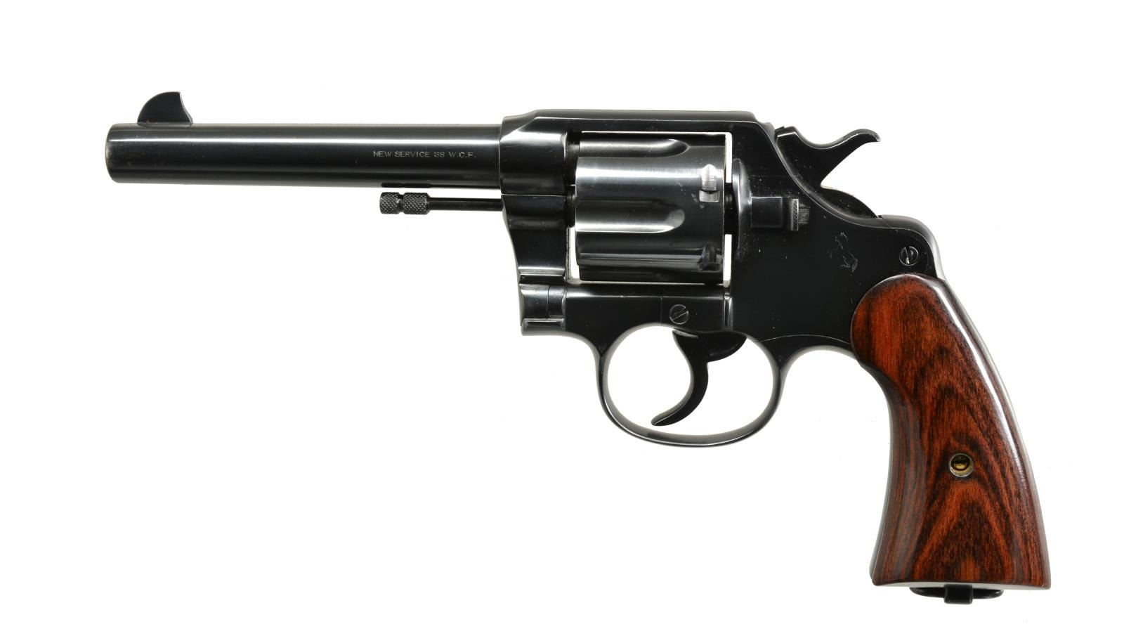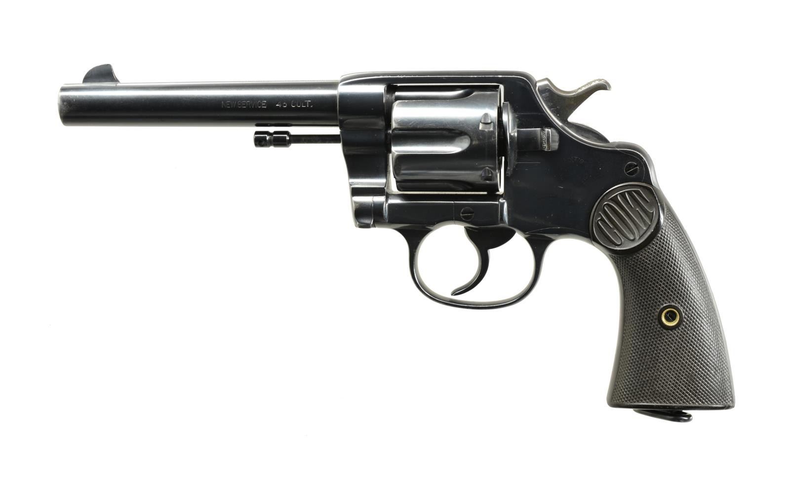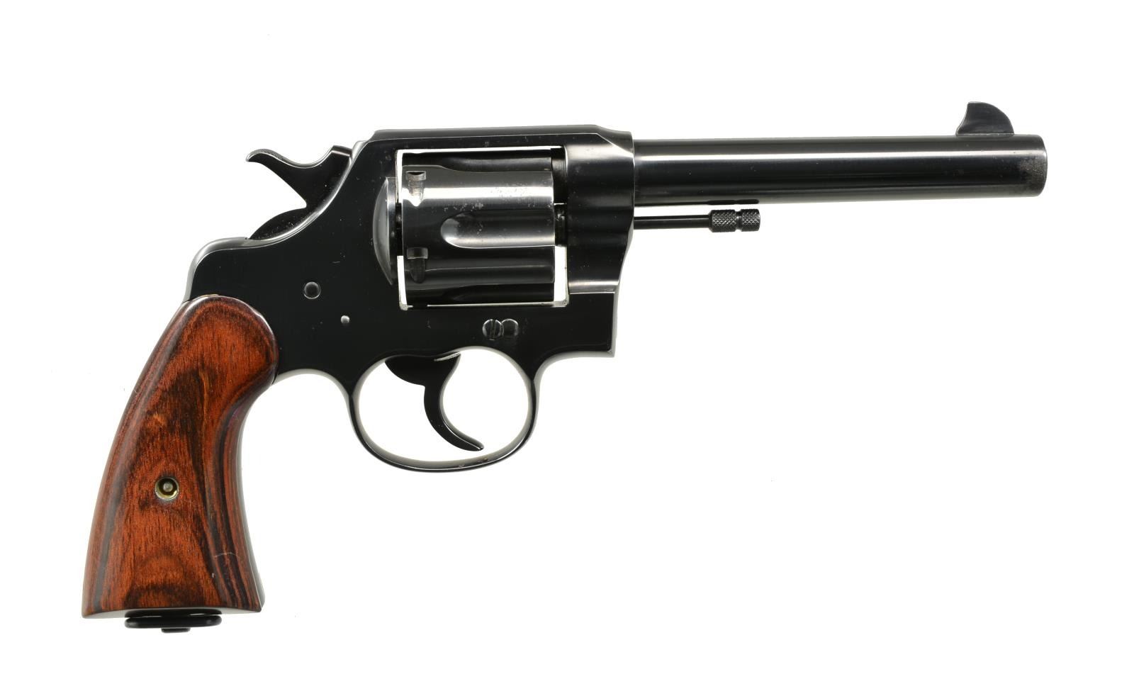 1) Cal. 38 WCF. S# 113095. Bbl. 5 1/2" w/ blade front sight. 6 Shot fluted cyl. 2 Piece aftermarket laminated wood grips w/ lanyard ring at butt. 1916 Mfg. CONDITION: over 95% reblued finish w/ a spot of pitting at muzzle. Grips have good finish. Smooth mechanics. Bright bore w/ strong rifling. (20-2430/DS). 2) Cal. 45 Colt. S# 2708. Bbl. 5 1/2" w/ blade front sight. 6 Shot fluted cyl. 2 Piece checkered hard rubber Colt marked grips w/ lanyard ring at butt. 1900 Mfg. CONDITION: 90% reblued finish showing muzzle & edge wear. Markings show weakness from polishing. Grips show moderate wear. Smooth mechanics. Bore retains sound rifling. PROVENANCE: From the Frederic W. Thrane Collection. (20-2431/DS). BOTH CURIO. $1,000-1,400.