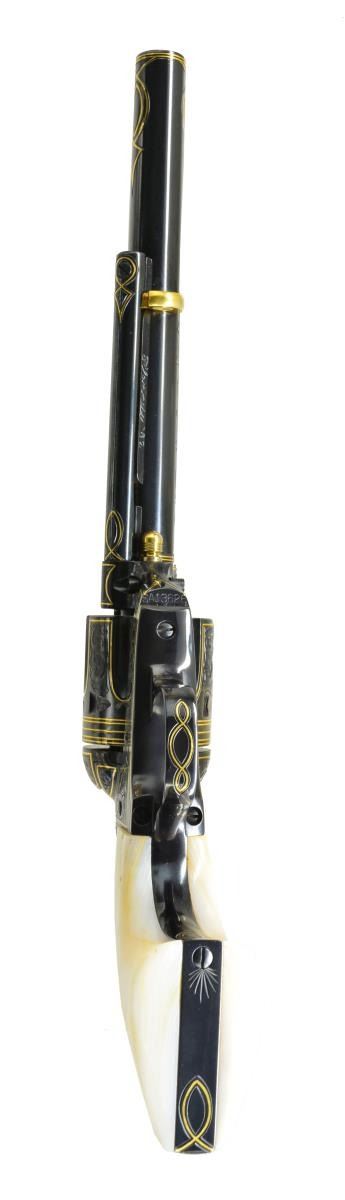 ALL: cal. 45 Colt. Bbls. 7 1/2" w/ blade sight. 6 Shot fluted cyls. Frames, cyls., bbls., grip straps & hammers have foliate scroll engraving w/ punch dot & cross hatched backgrounds. Gold wire inlaid accents are found on frame, cyl., bbl., grip straps & ejector housings. Engraver's signature "FLANNERY 82" is found inside of ejector housings. Jeffrey Flannery resides in Kentucky. Hammers, triggers, cyl. pins & ejector heads have gold finish. 1 Piece pearls grips. UNATTACHED ACCESSORIES: glass fronted wood presentation case w/ red fitted interior. Case contains pearl handle cleaning rod, brush & 2 turn screws, oil bottle, & accessory box. 2 Corners of case have cartridge blocks holding 6 rds. each of 45 Colt. CONDITION: both retains over 95% custom blue finish w/ very good grips. Near excellent bores. 1) S# SA13626. (20-4065/DS). 2) S# SA12950. PROVENANCE: Collection of Alan Bradley Shepherd. (20-4066/DS). ALL MODERN. $7,000-10,000.